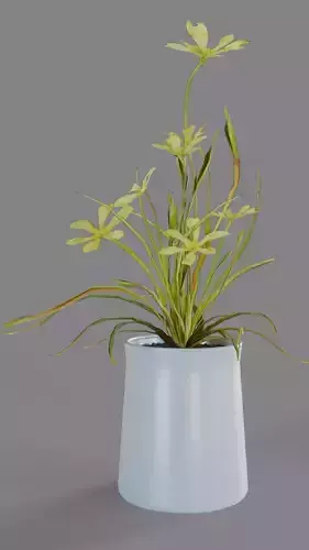 This high-quality 3D model features a realistic potted plant with long, slender green leaves and delicate pale yellow flowers. The flowers are distributed naturally across varying heights, enhancing the organic feel. The plant is housed in a smooth, white cylindrical pot filled with dark soil or pebbles, set against a neutral gray background for optimal presentation.Perfect for interior visualization, architectural renderings, or game environments, this model combines botanical elegance with clean modern design. Ideal for use in Blender, Maya, 3ds Max, Unity, Unreal Engine, and other major platforms.Features: