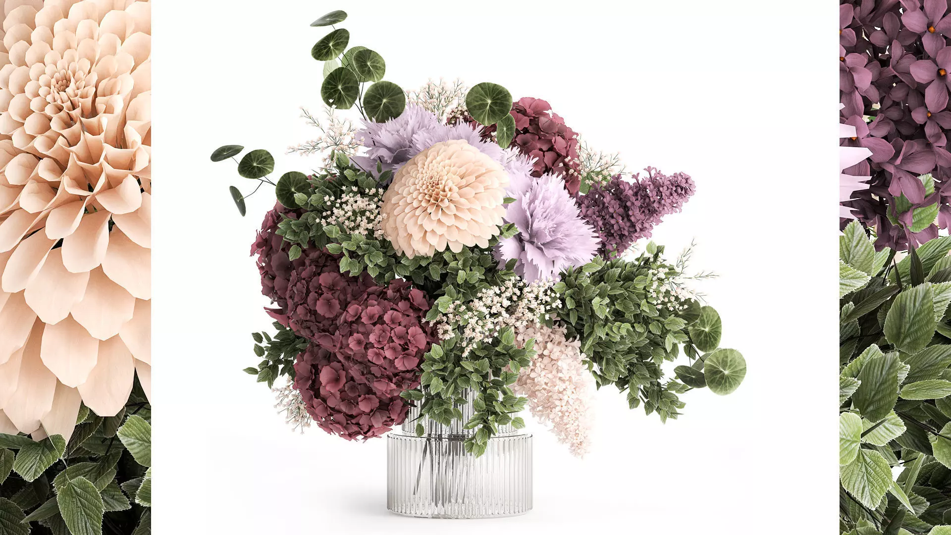 Small bouquet of flowers hydrangea lilac dahlia vase