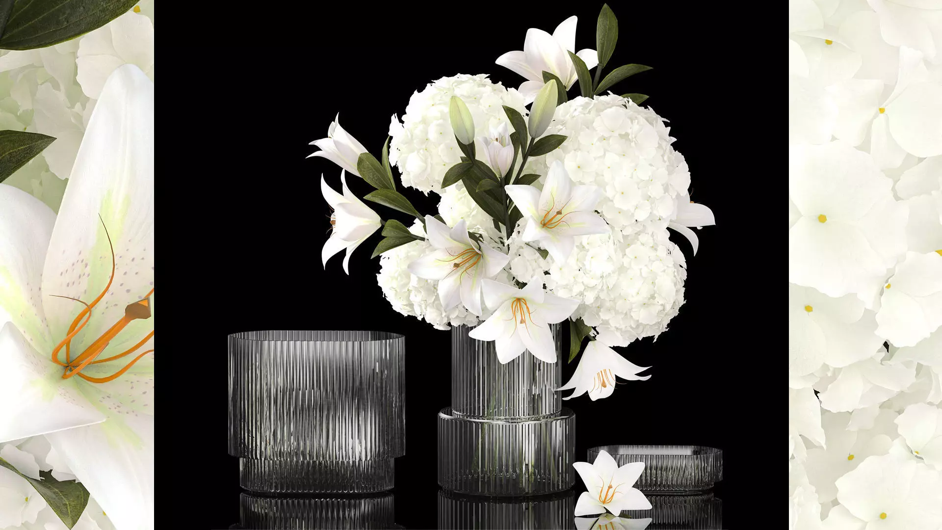 White formal bouquet of flowers and greenery in a modern glass vase, hydrangea, lilies. Set 354.Decorative Bouquet of white flowers in a glass vase for decoration and interior.Bouquet of branches and flowershydrangea - white hydrangeaSpring bouquetvases - 2.hm, H&M HOMELilium, Liliaceae - white lilies