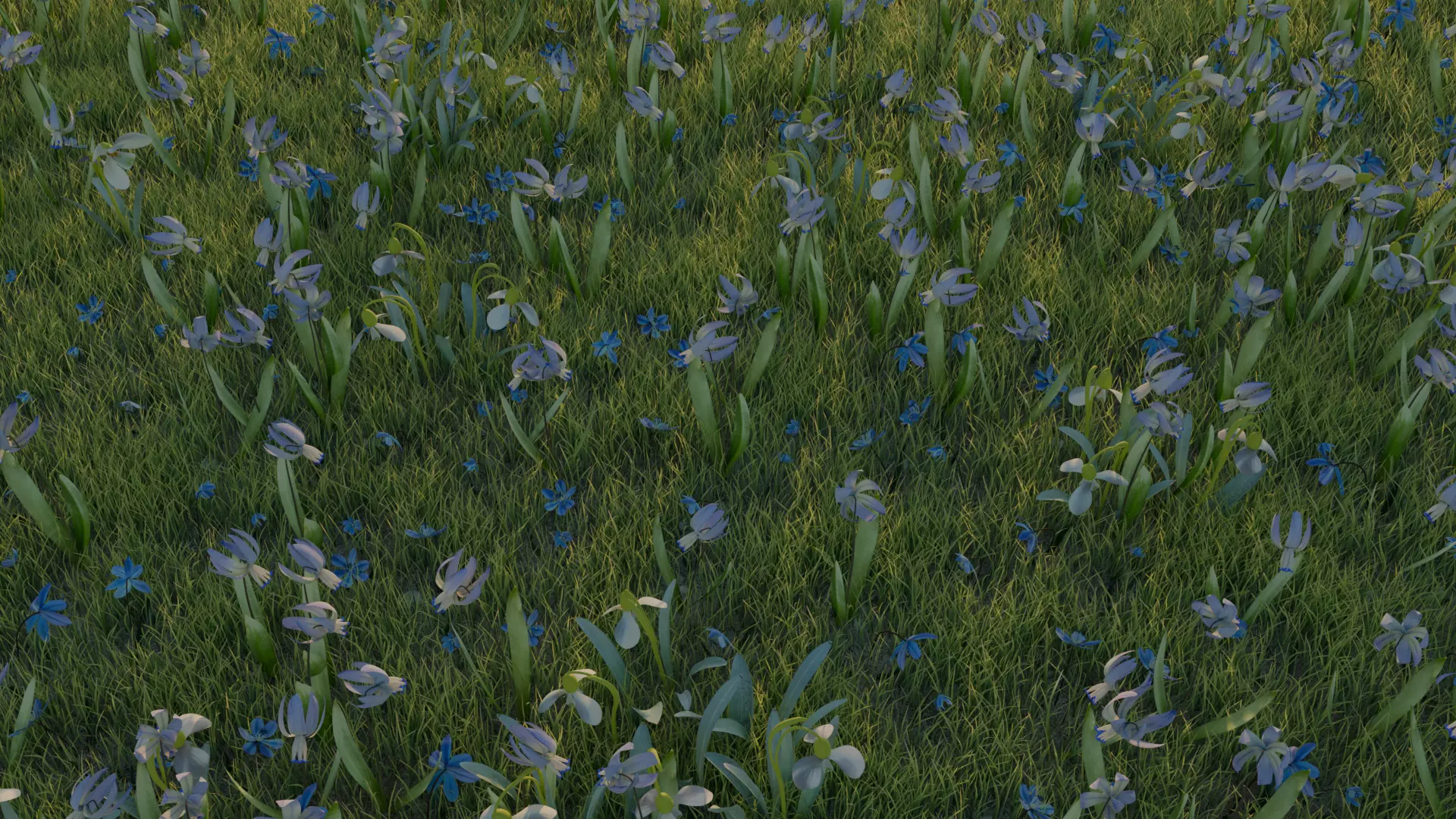Models of three spring flowers - Scilla (blue one), Scilla Rosenii (light blue) and Snowdrop. A sample meadow with grass was created for illustration with Blender geometry node system.