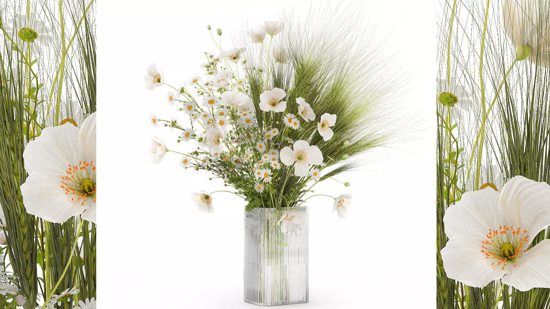 Beautiful summer designer bouquet of wildflowers in a modern glass vase with poppy, chamomile, wheat. Set 430.Summer bouquetBouquet of wild flowersvasePapaver nudicaule - Hollow-stem poppy, Icelandic poppyMatricaria, chamomile, daisies - Chamomile, Information, Navel, Tanacetum, TansyMayweedbouquet of white and green flowersTriticum, spikelet - Wheat, spikelet, vase, green wheat, wheat bouquet