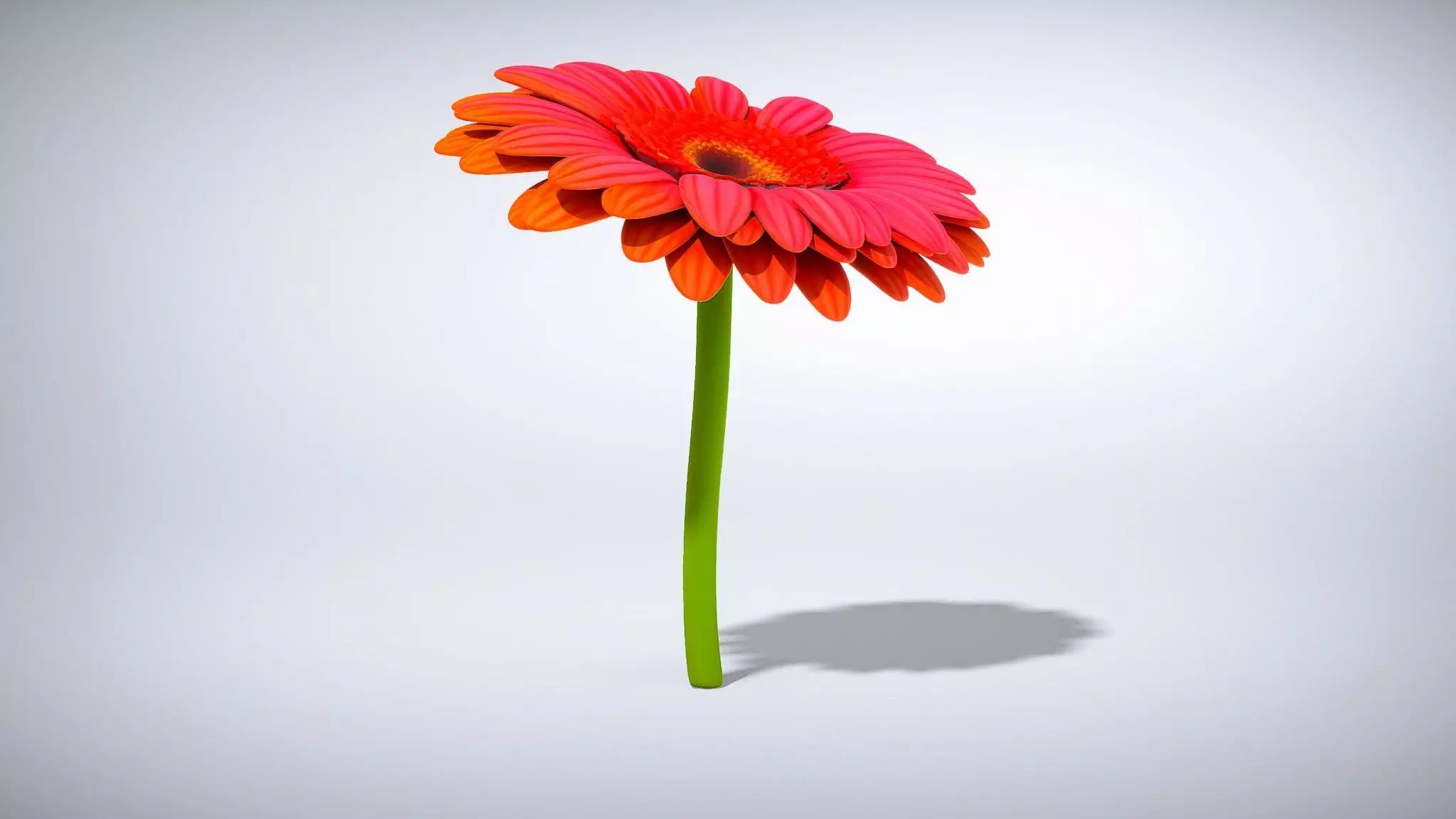 This model represents a vibrant gerbera flower with intricate petal details and a slender green stem. Each model has 3 levels of detail with QUAD polygons: