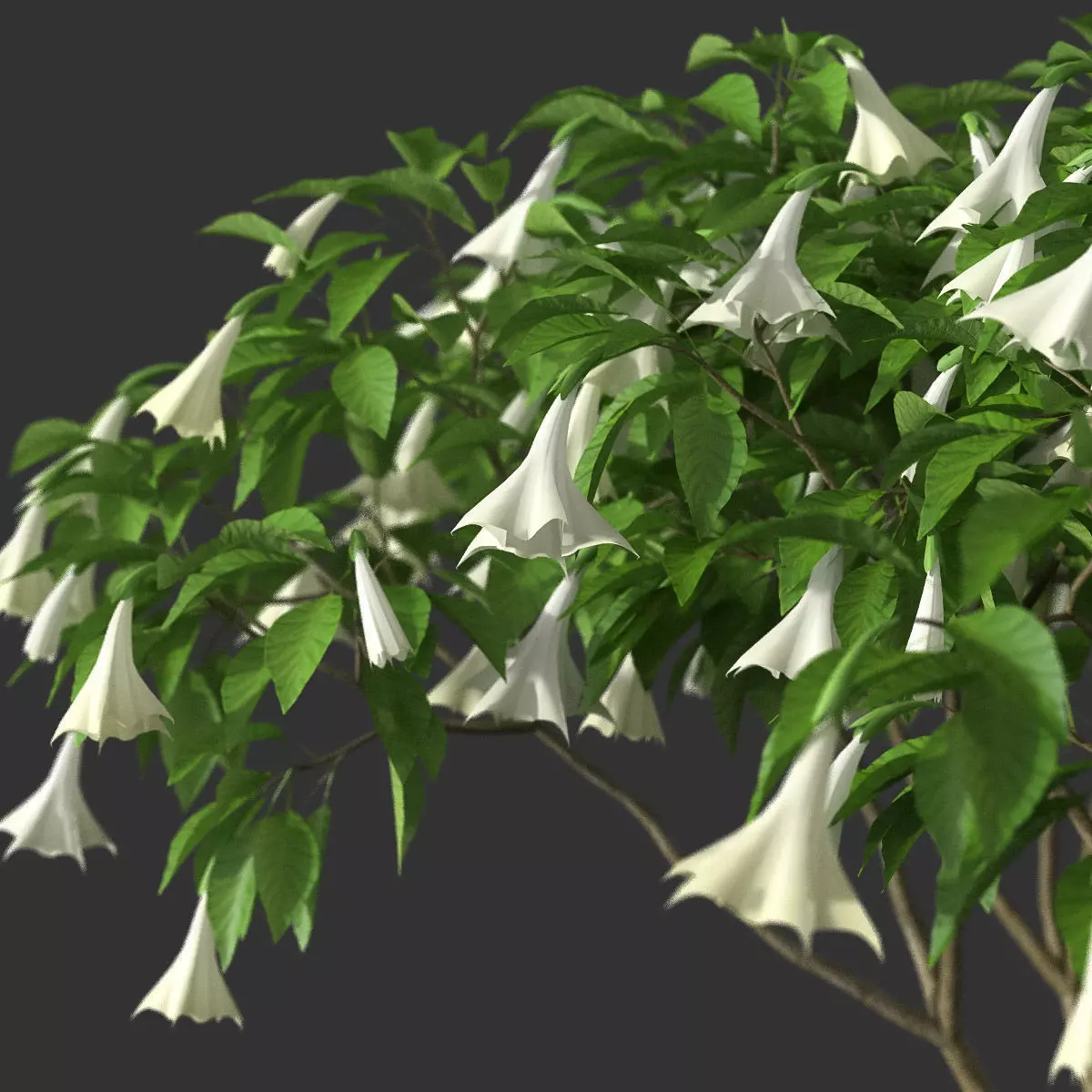 Brugmansia Arborea: Angels TrumpetThe Angels Trumpet is native to the Andes mountains of southern Colombia, Ecuador, Peru, western Bolivia, and northern Chile. As the hardiest of all Brugmansia species in regards to both cold and drought, they are often found in the drier valleys of the Andes. It is a relatively small evergreen tree or shrub that rarely reaches beyond 25 ft in height. The trumpets can reach to lengths of seven inches. Brugmansia arborea are usually pollinated by moths, attracted by the gleaming white flowers and potent fragrance that grows stronger in the evenings.