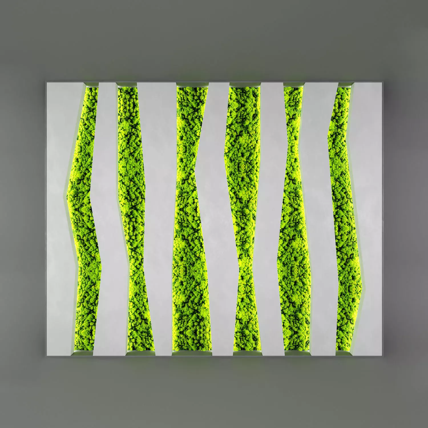 A stunning piece of contemporary biophilic wall art featuring vibrant, textured moss in vertical, undulating strips. The bright, neon green preserved moss is set against a smooth, light grey or white panel. The installation is backlit with a warm, bright light, making the moss strips glow and creating a dramatic, immersive focal point. This piece combines natural texture with modern, abstract design, perfect for adding a pop of color and organic feel to a modern office, residential space, or luxury interior.