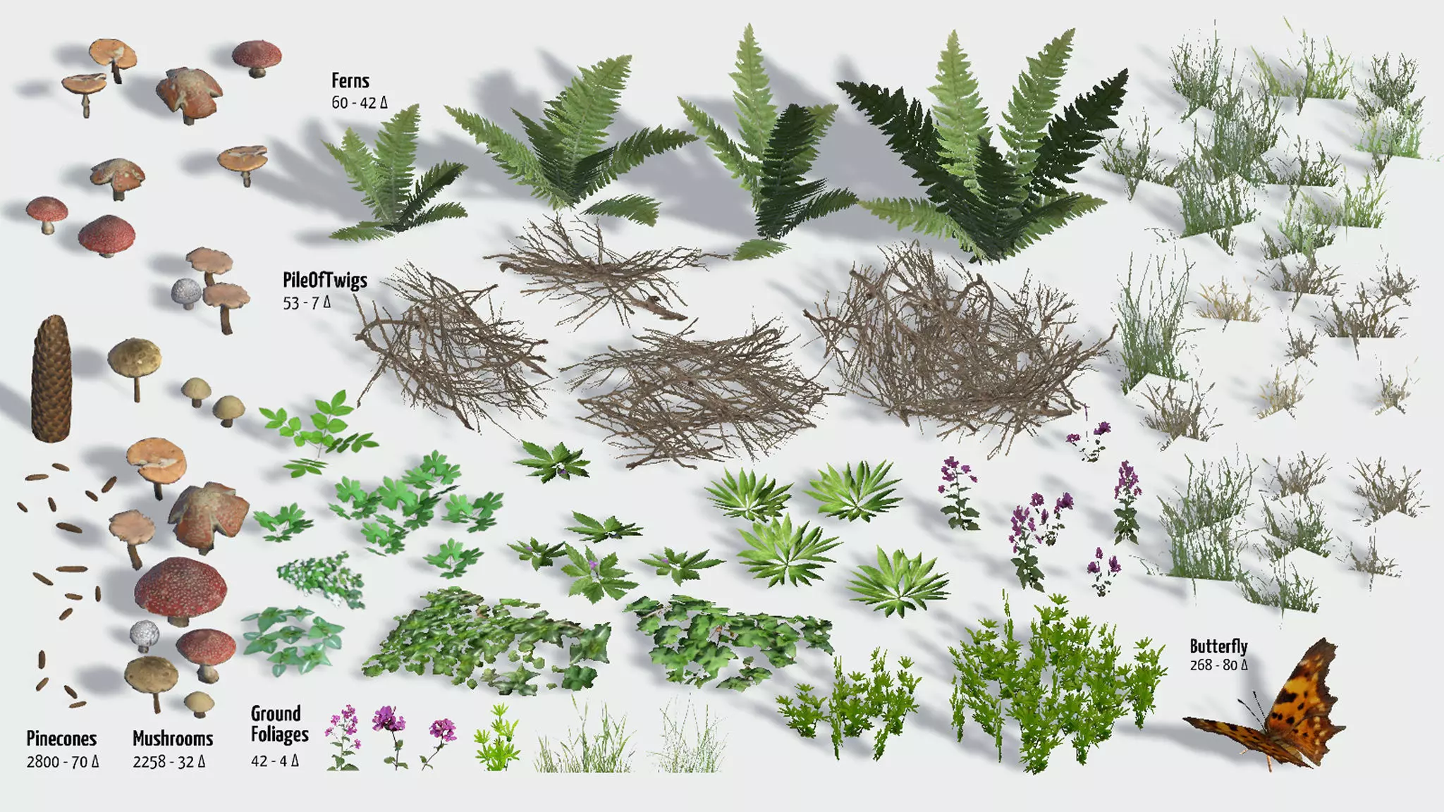 • 21 models of forest foliage (4 variations of fern; 8 types of ground foliage, 9 variations of ivy)
