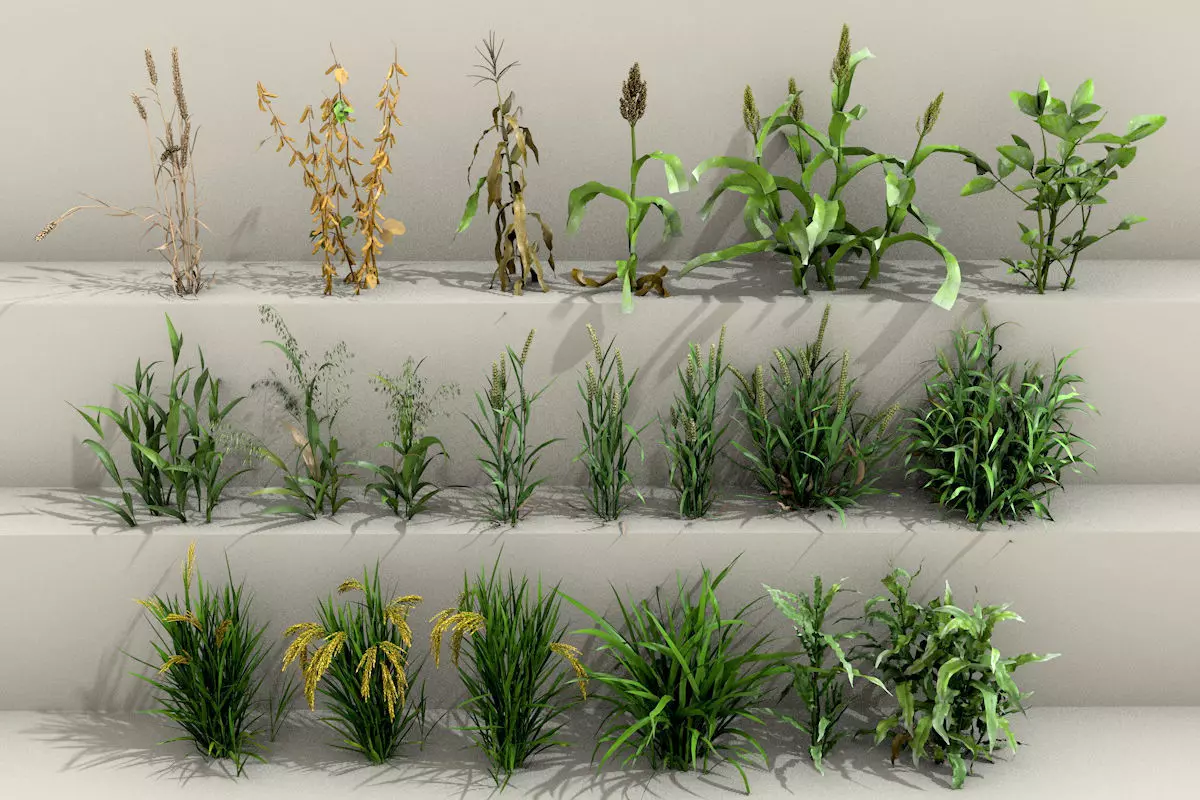 The pack features common farm crops such as wheat, rice, corn, barley, oats, and sorghum, with clean geometry and optimized structure.All textures are included, and the models are suitable for real-time engines as well as offline rendering workflows.