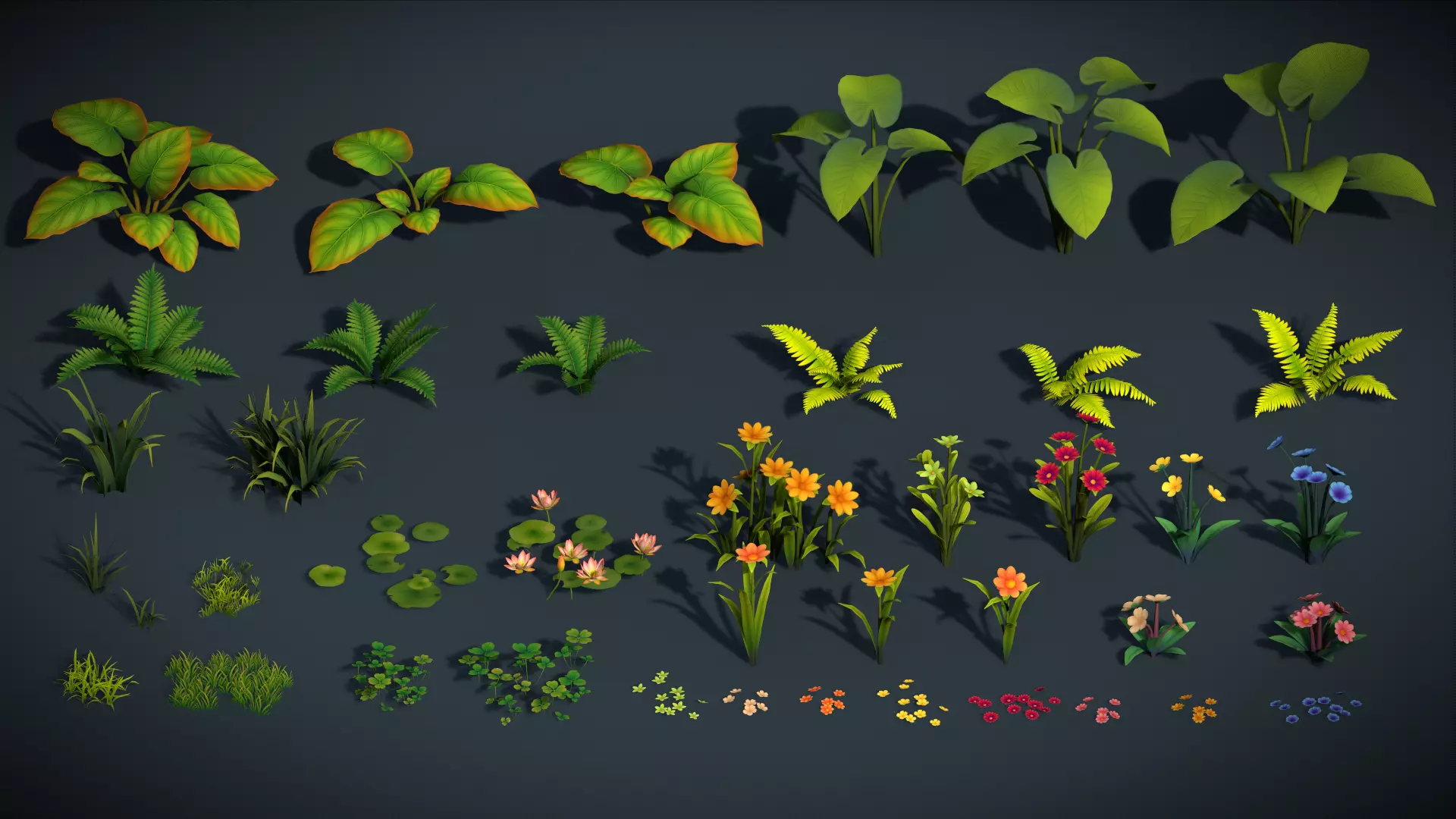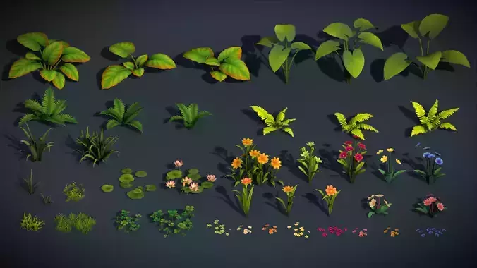 All assets are designed with a clean stylized look, smooth shading, and vibrant colors, making them ideal for forest, jungle, garden, and fantasy game environments.