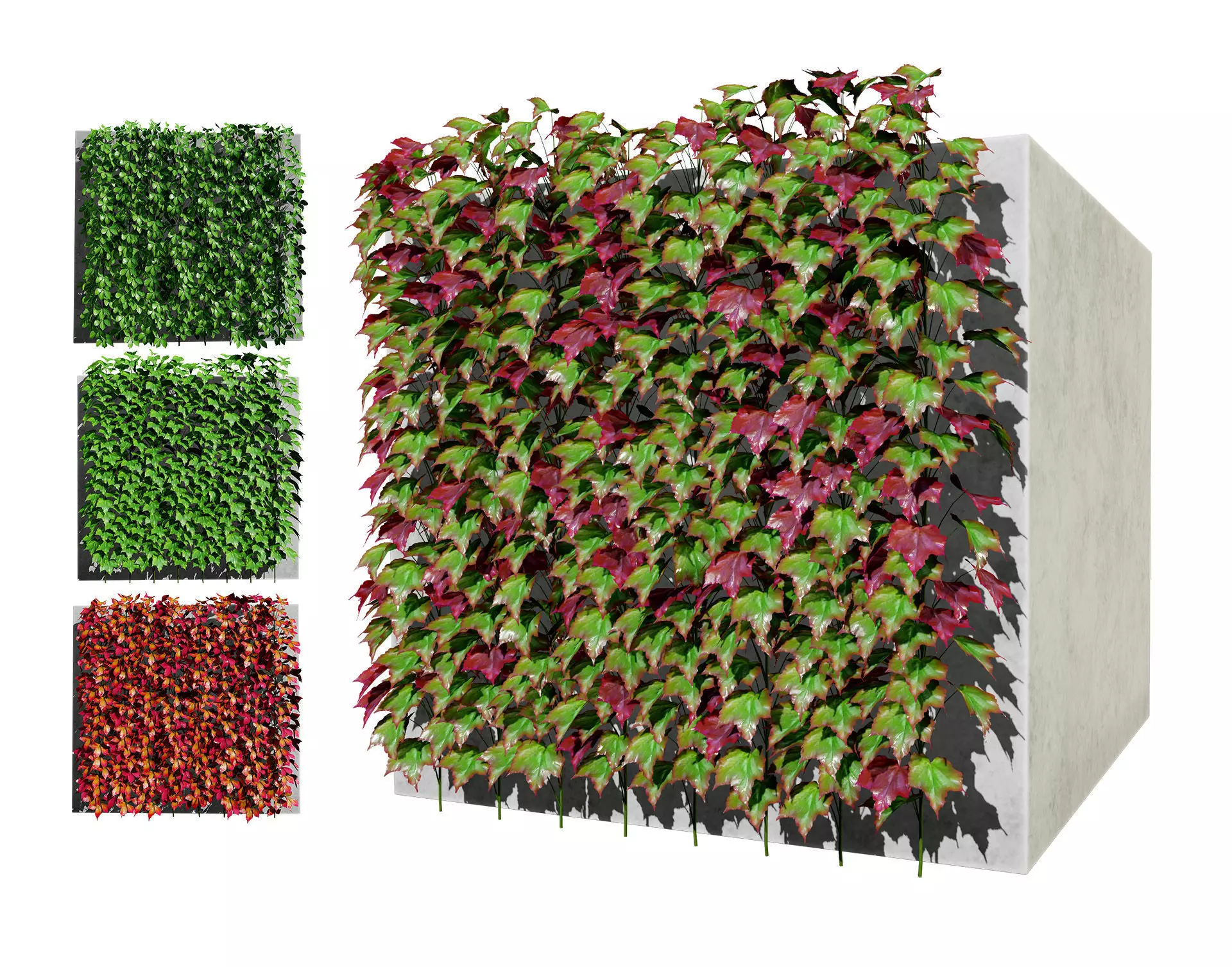 This meticulously crafted 3D model showcases a charming wall covered in lush green and autumnal foliage. The combination of Virginia Creeper and Boston Ivy adds a touch of natural elegance to any architectural or landscaping project.Fall Boston Ivy with green and red leaves.Summer Boston Ivy with green leaves.Fall Virginia Creeper with red orange leaves.Summer Virginia Creeper with green leaves.