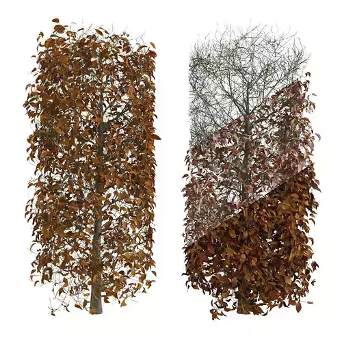 Highly detailed 3D model of a trimmed hornbeam in autumn and winter states. The pack includes 4 variations, featuring trees with full foliage, bare branches, and a frosted effect created using a texture mask. Polygon count ranges from 596,107 (dense foliage) to 359,751 (leafless winter version).
