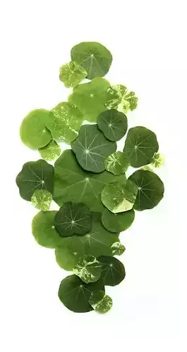 Download the elegant 3D model of a green leaves pattern, a beautifully composed digital recreation of a natural leaf arrangement made from overlapping Tropaeolum (nasturtium) leaves. This leaf collage 3D model features circular, shield-shaped foliage in varying shades of green — from deep emerald to light lime — with visible veins and subtle variegation that enhance its organic texture. The leaves are arranged in a vertical, teardrop-like composition, creating a visually balanced and artistic design ideal for use in interior decoration, wall art, textile design, digital printing, NFT art, and biophilic design projects.