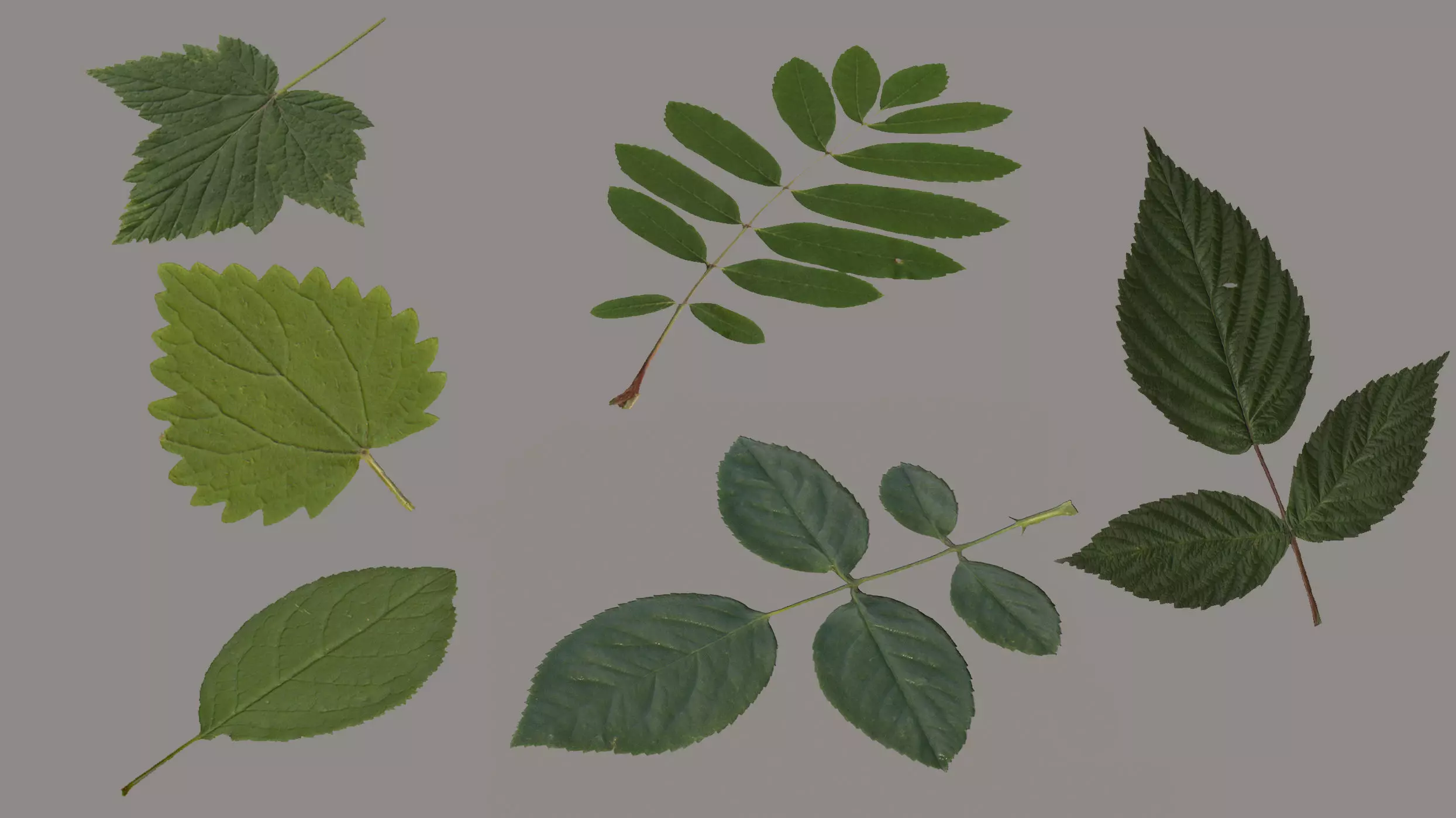 Photoreal leaf pack PBR material. Pack has 7 PBR material leaf (Rowan, Raspberries, , Nettle, Rose, Plum, Сurrant, Сhestnut)7 textures: Diffuse, Normal, Glossiness, Displacement, Transucency, Alpha, Bump 1 polygon.