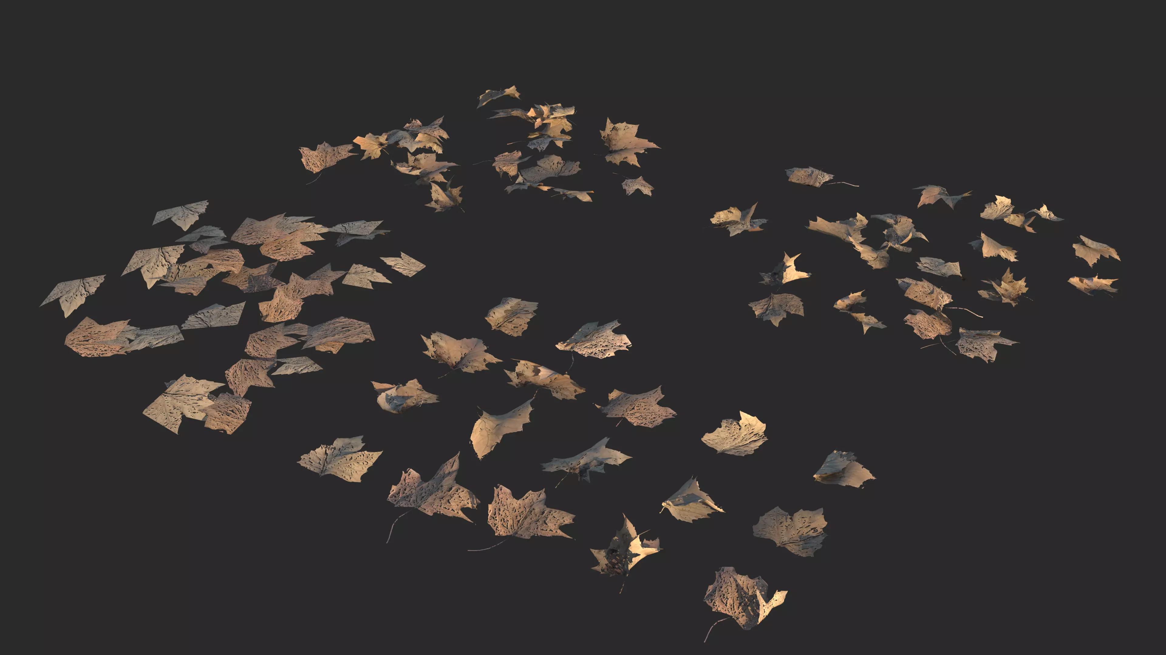 This is a high-quality, photorealistic collection of various dry leaves and woody debris, perfect for creating lifelike natural environments, forest floors, architectural visualizations, and game levels. Each asset pack has been created using photoscanning techniques to capture incredible detail and realism.