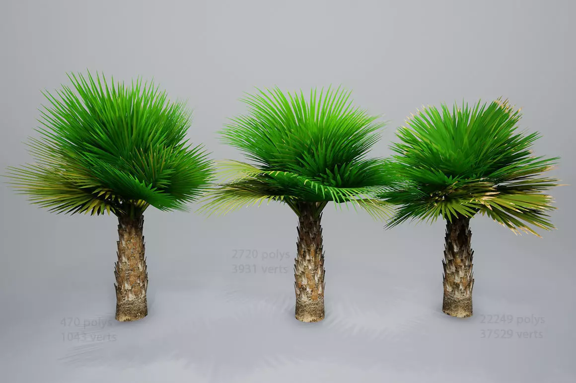 Photorealistic highly detailed 3D model of palm .The model has three levels of detail and is perfect for creating game locations as well as for creating architectural visualization and interiors.TOTAL SCENE : 25439 polys; 42503 verts;