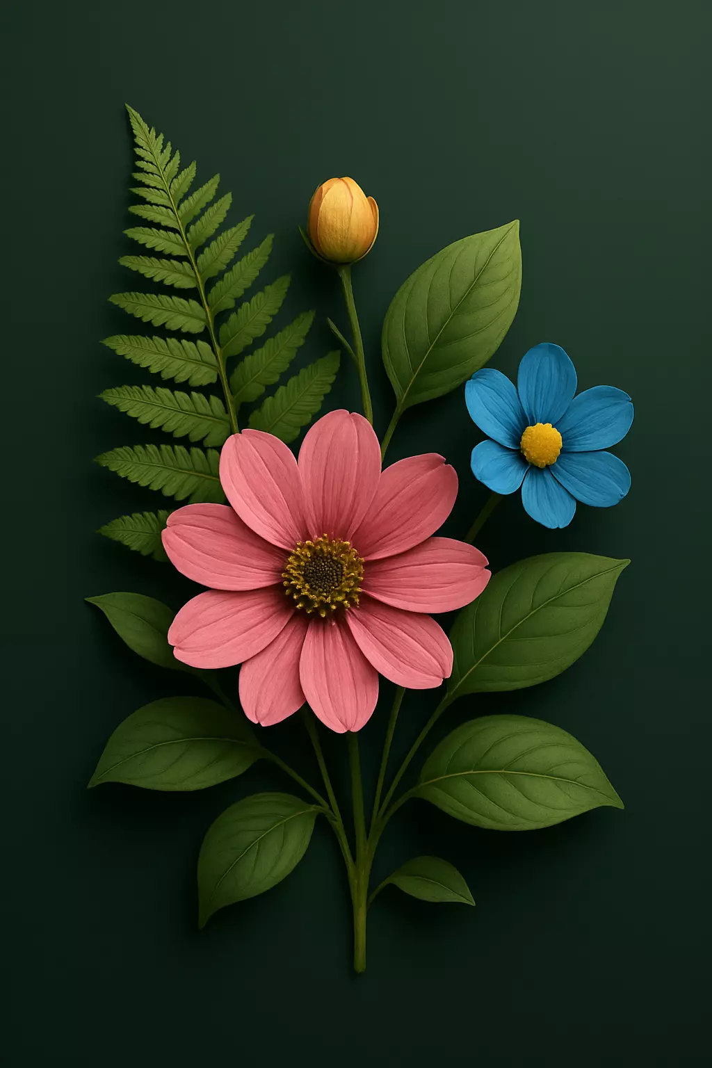 A tall, detailed Green Fern leaf adding texture.