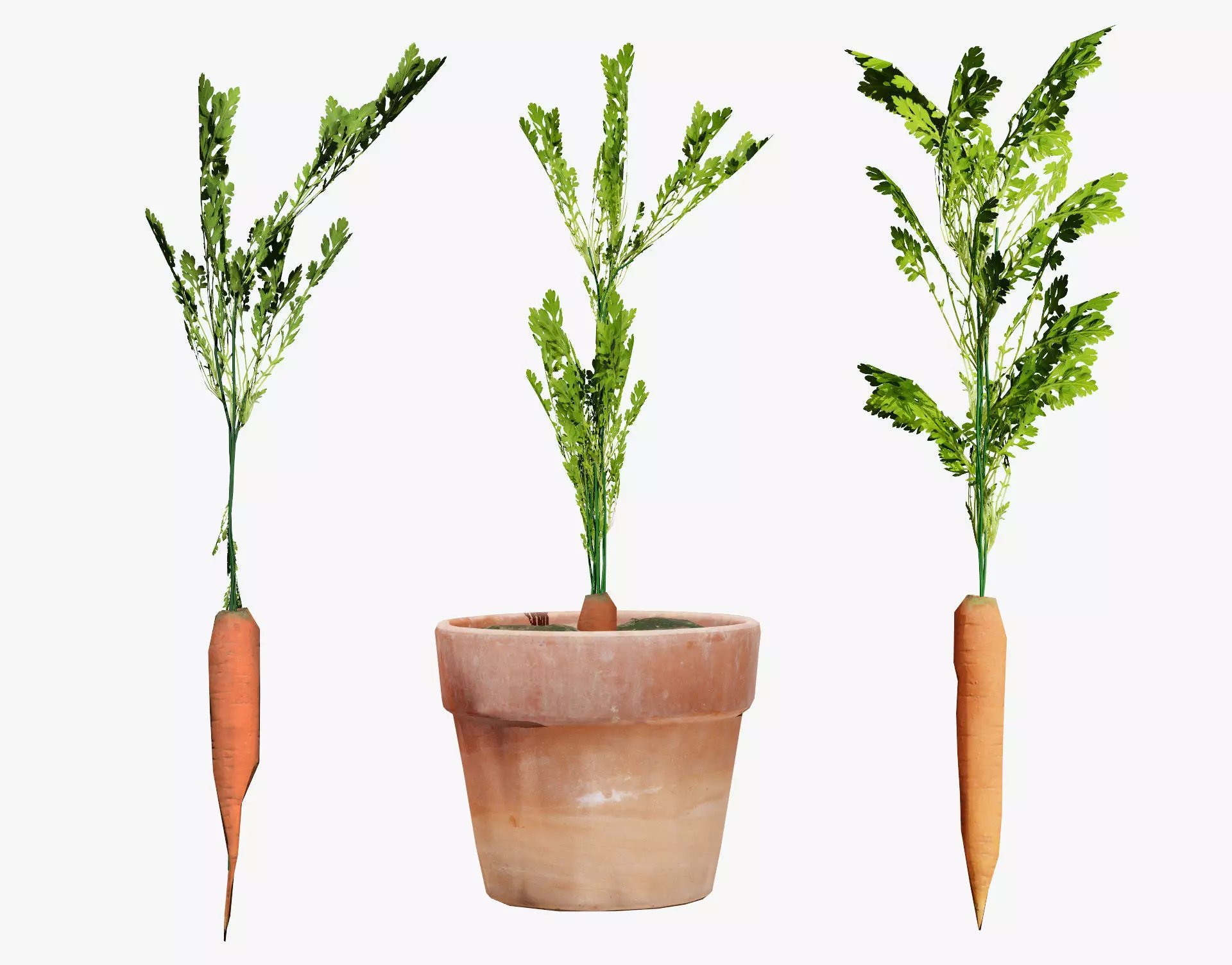 High-quality 3D model of three carrot plants in various stages of growth. Includes detailed textures for the leaves, roots, and soil, as well as realistic lighting and shadows. Ideal for creating immersive virtual environments or photorealistic renders.