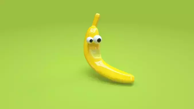 A bright yellow banana-shaped cartoon character with a smooth, slightly curved body and a cheerful personality. It has big, expressive eyes, a wide smile. The peel curls slightly at the top like a playful tuft of hair. Perfect for kids’ animations, healthy eating campaigns, or playful educational content.
