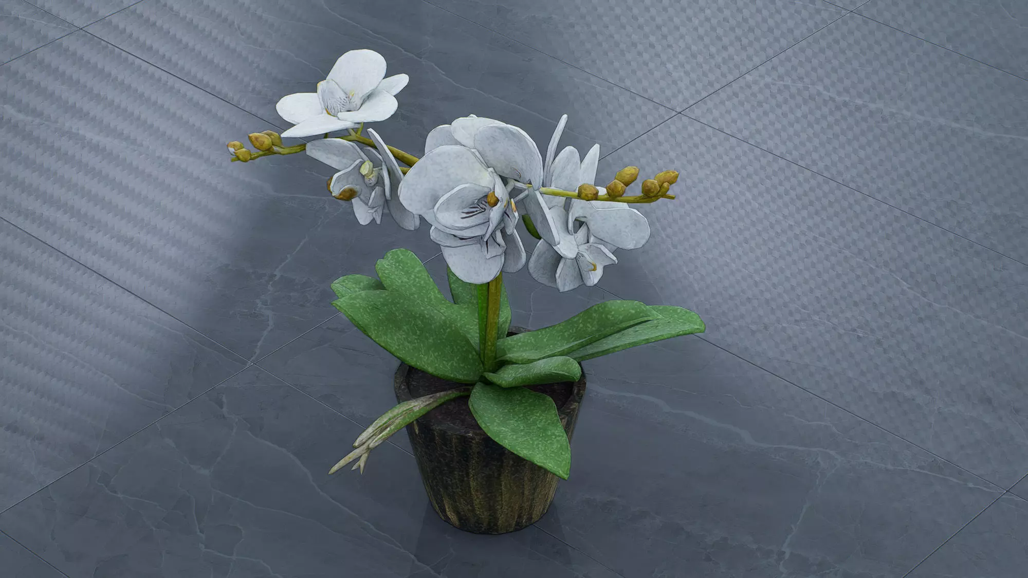 This low-polygonal 3D model of a butterfly orchid presents a white-flowered orchid with broad green leaves housed in a dark pot, set against a gray tiled floor. Crafted with simplified geometry, it balances aesthetic appeal with efficiency, ideal for applications like games, VR, or AR environments.