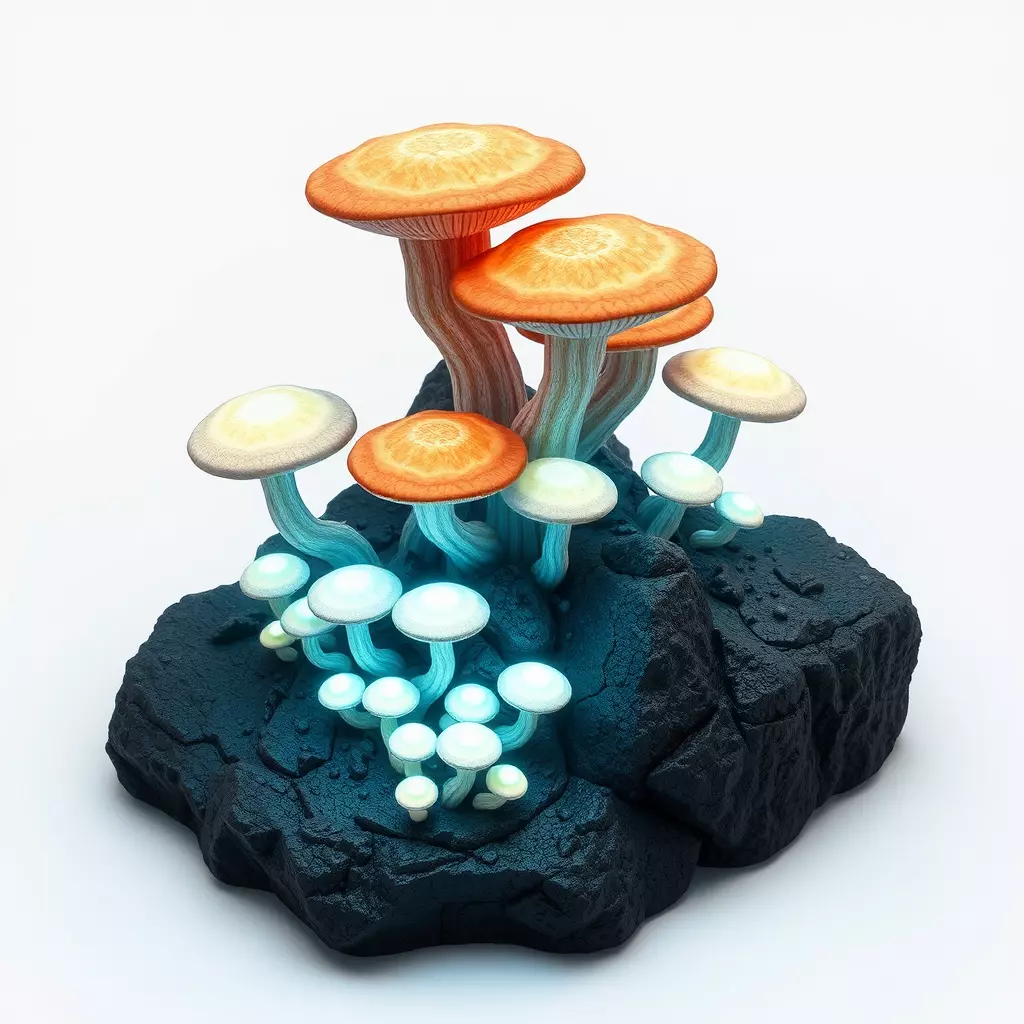 This is a stunning 3D model of a fantastical mushroom cluster, featuring both traditional-looking fungi with warm orange caps and an enchanting group of bioluminescent mushrooms emanating a soft, magical blue glow from their caps and stems. The mushrooms are intricately arranged upon a textured, dark rock formation, creating a captivating natural diorama. This versatile asset is perfect for enriching a wide array of digital environments, from mystical forests in fantasy game development and immersive AR/VR experiences to captivating digital art scenes and stylized architectural visualizations. Its unique design also makes it an excellent candidate for decorative 3D printing. The model is meticulously crafted with clean topology, ensuring smooth deformations and easy integration into any project pipeline. It comes fully UV unwrapped with professionally optimized PBR textures, including emissive maps to perfectly capture the ethereal glow, suitable for both real-time applications like games and high-quality static renderings. Supported file formats include GLB, OBJ, STL, ABC, DAE, FBX, USD, and PLY, offering broad compatibility across various 3D software and engines. Whether you need an eye-catching environmental prop or a centerpiece for a magical scene, this mushroom cluster delivers exceptional visual appeal and performance.
