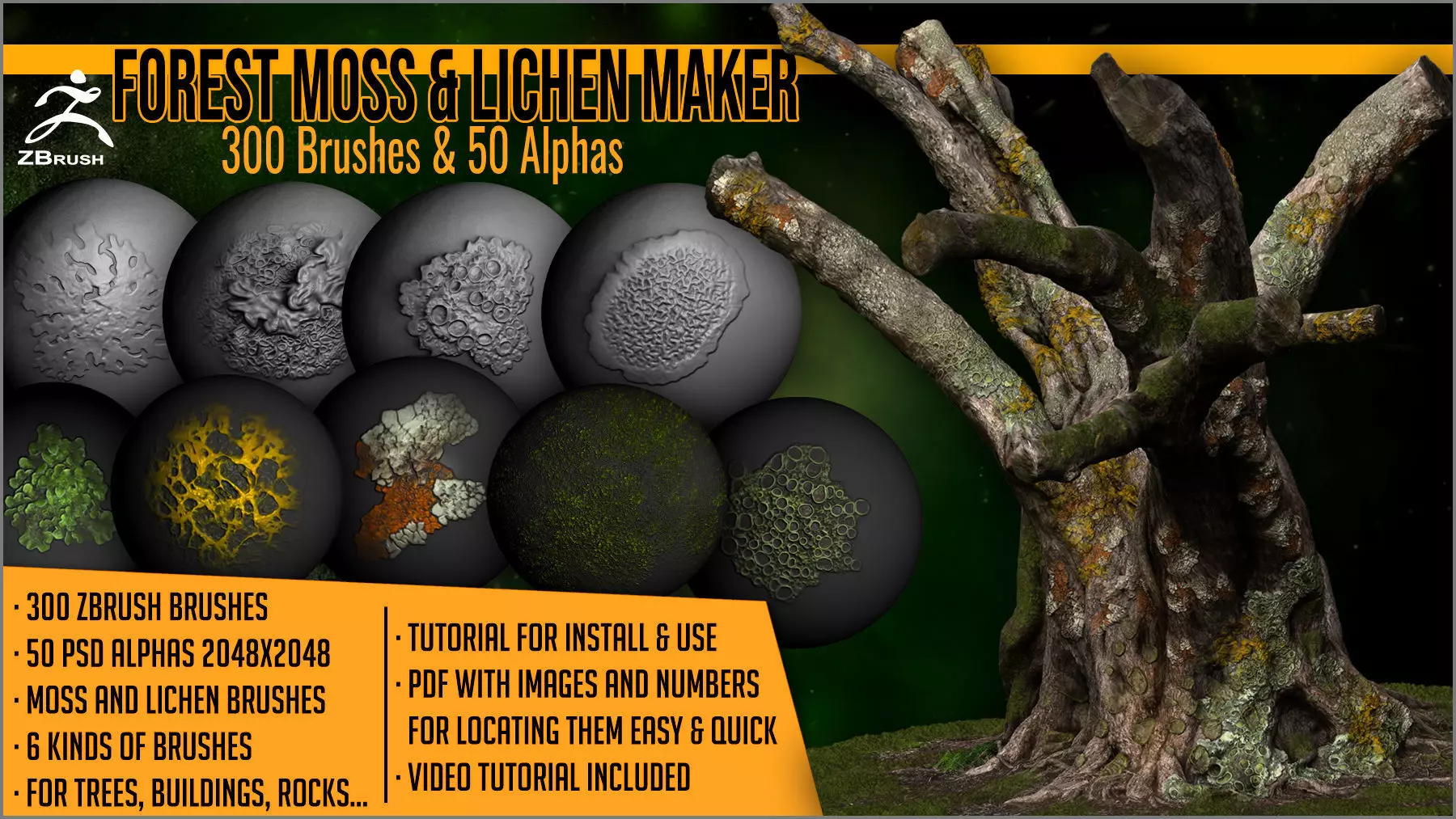Forest Moss And Lichen Maker is a set of 300 brushes and 50 alphas for sculpting and painting moss and lichens and micro-fungus on nature and forest scenes, over stones, old buildings, abandoned places, trees, rotten wood, abandoned furniture, and even on characters and fairy creatures like dryads and elves, and anything you imagine.