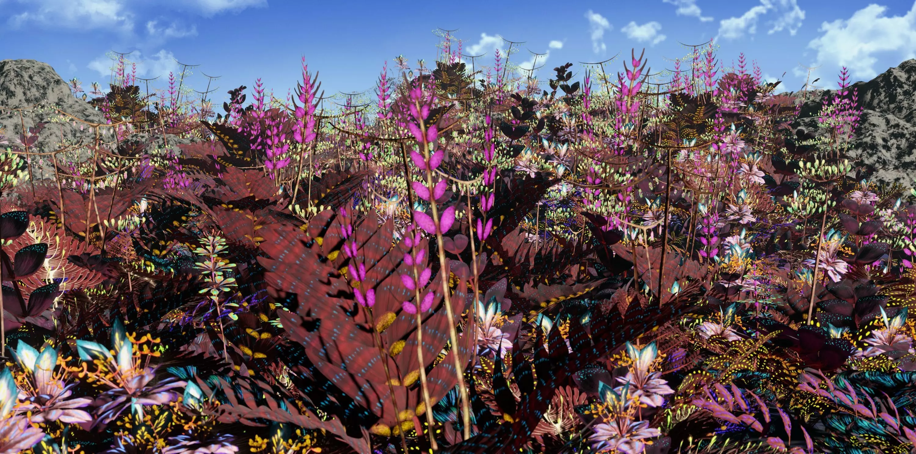This set contains 7 species of middle-sized, partially flowering or fruiting herbs, which are composited from sheet elements. The wingleaf, reticulated wingleaf, curled wingleaf, millweed and scrawlerleaf items has a set with and without fruit. Each group has 8 different individual objects, being singular fronds, plants made from the fronds and the same plant models with added fruit and flower stems for the listed species. The material setup includes diffuse maps (with the surface texture and colouration being separate), roughness, normals and emission (for the bioluminescence), as well as a translucency effect for the leaves and weedy stems. By having the colour and surface texture separate, it is reasonably easy to either edit the colouration of the plants with RGB curves or give the leaves a different colouration altogether. All plants also have glowing patterns, which can be edited in a similar way to the colours, or removed by setting the emission node to 0 or disconnecting the nodes.
