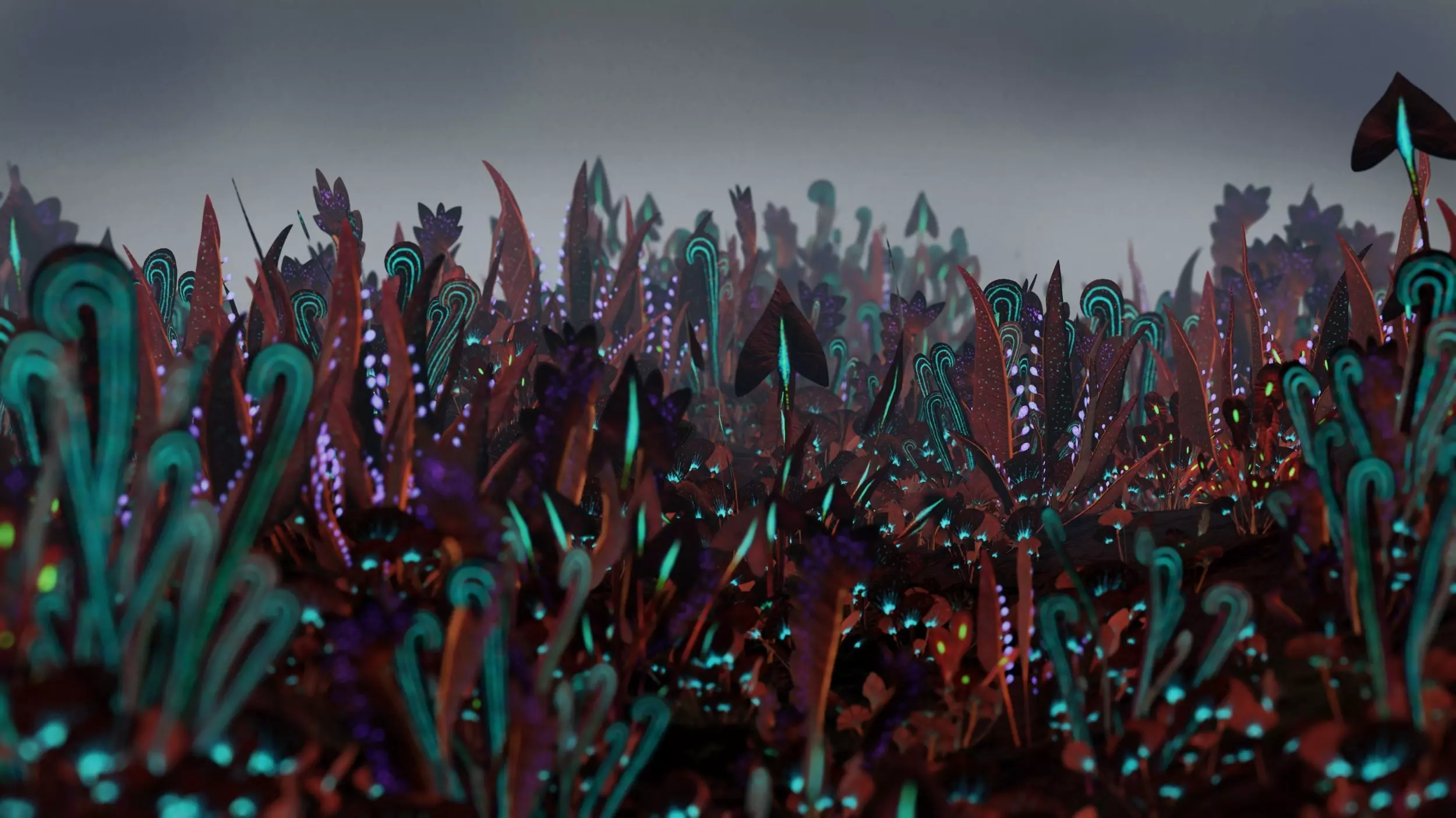 This set contains 7 species of small to middle-sized plants, which come as single-leaf cards, three-dimensional planes (5 different shapes) and 8 small groups. Height resolution of the plants varies between around 700 to 2500 pixels. The material setup includes diffuse maps (with the surface texture and colouration being separate) roughness, normals and emission (for the bioluminescence), as well as a translucency effect. By having the colour and surface texture separate, it is reasonably easy to either edit the colouration of the plants with RGB curves or give the leaves a different colouration altogether. All plants also have glowing patterns, which can be edited in a similar way to the colours, or removed by setting the emission node to 0.