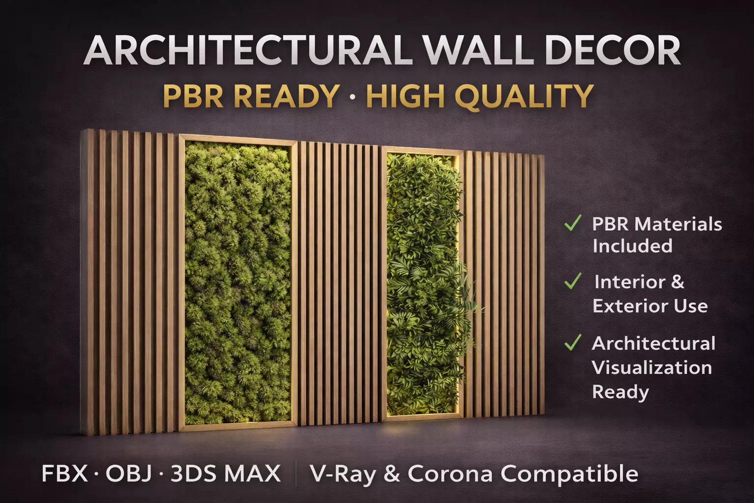 This high-quality architectural wall decor asset features a modern combination of vertical wooden slats and integrated green wall panels. Designed for contemporary interior and exterior visualization projects, it brings a natural, elegant, and premium atmosphere to any architectural scene.
