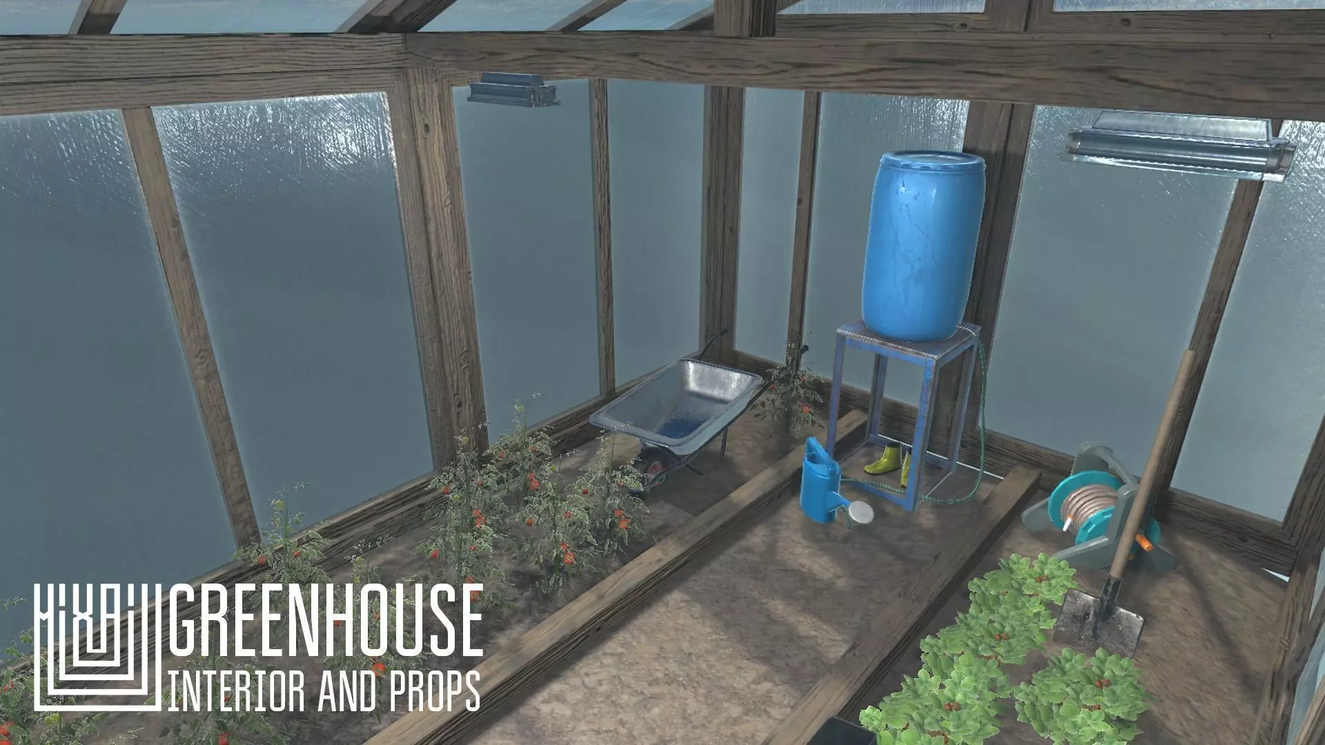Mixaill studio presents a good solution for your games, VR projects and simulators.Greenhouse - interior and props is room for plants with necessary equipment and furniture that will help you save time on implementing your ideas.Pack includes a large set of necessary models:greenhousedoorbailerbarrelbootsboxcoilFito- lamponionpotrakeshovelwheelbarrowtomatoStrawberry