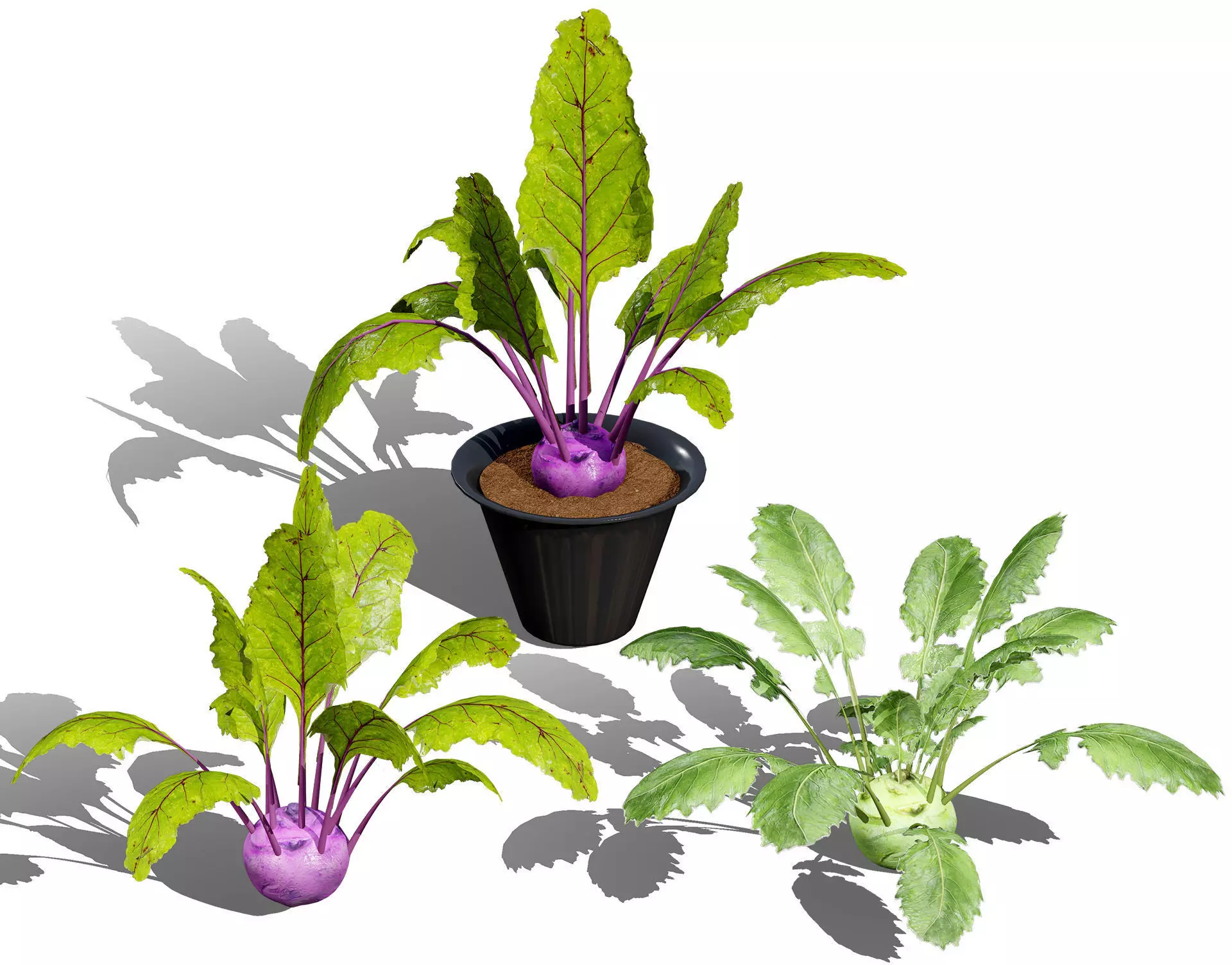 Elevate your 3D scenes with our meticulously crafted collection of Kohlrabi plants, perfect for adding a touch of natural realism to architectural visualizations, garden scenes, virtual landscapes, and product renderings. This high-quality 3D model pack includes three distinct variations of the Kohlrabi plant, showcasing different stages of growth and color palettes to suit a variety of artistic needs.This collection includes a red-purple kohlrabi with lush green leaves, a purple kohlrabi with a rich red-veined foliage, and a pale green kohlrabi with vibrant, broad leaves.