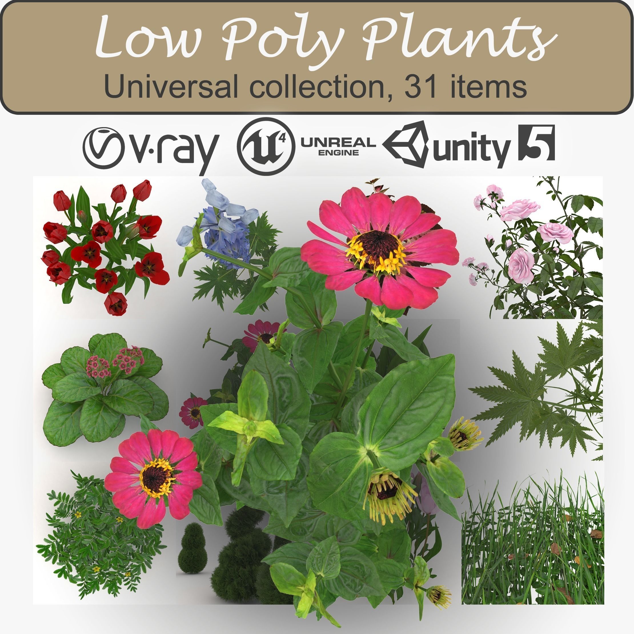 Universal plants collection: high res .png maps (2048*2048) with LODs for some plants, Unity 5 and Unreal Engine 4 supported, which means PBR(physically based rendering) ready, V-ray ready(3DMAX).