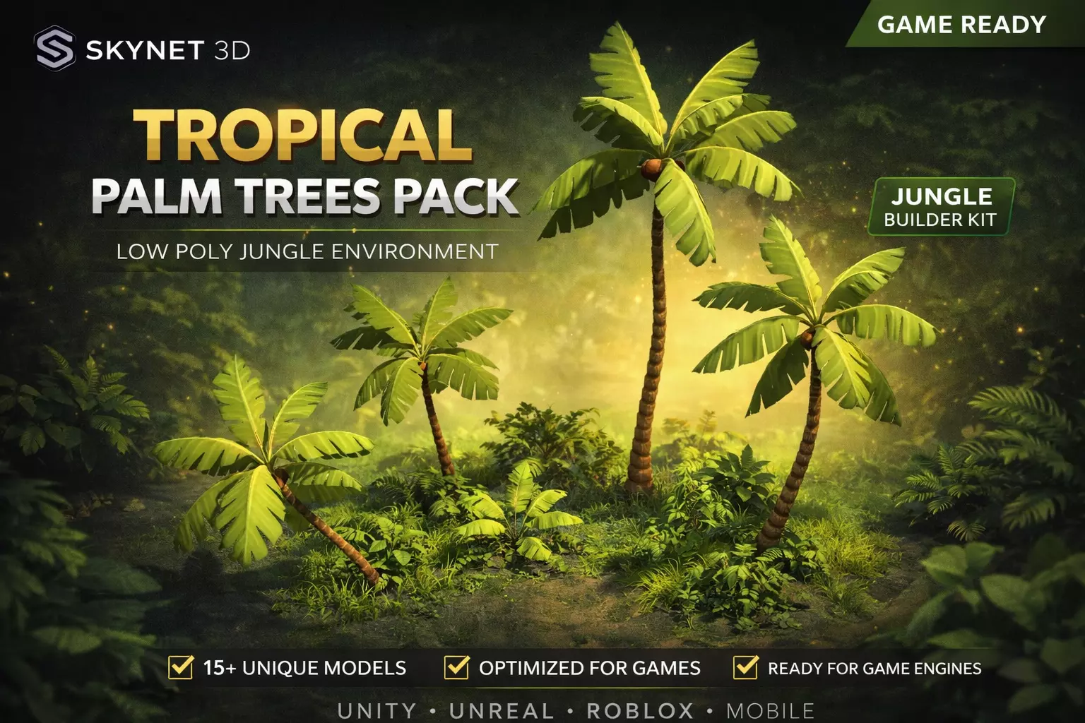 This pack includes a collection of stylized palm trees and tropical vegetation perfect for jungle environments islands beaches and outdoor scenes