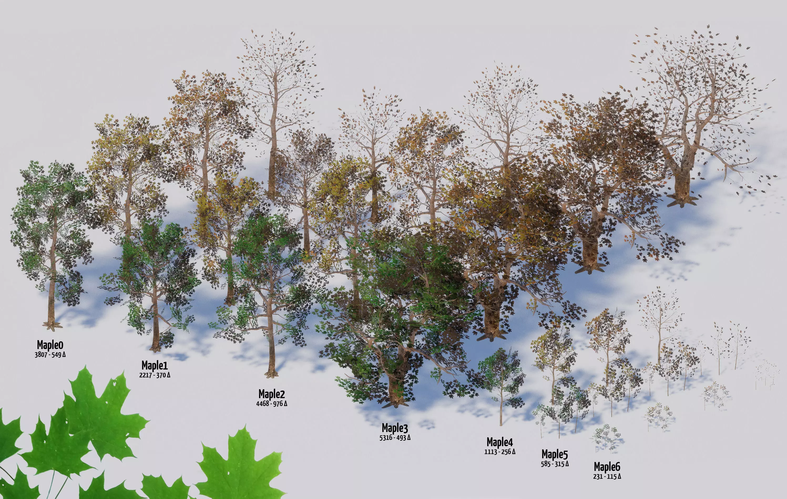 -7 unique maple tree models, in 3 seasonal variations (summer, autumn & winter), each with 3-4 LOD levels, ranging from 115 to 5316 triangles;-total of 120 trees (counting all LODs and seasonsal variations);-seamless bark textures, with normal & displacement maps;-transparent leaf textures (1 x summer, 2 x autumn & 1 x winter variations);-billboards included for GPU optimisation at distant forests;-mostly 2048 pixel texture maps, billboards are 256 pixel;These tree models were inspired by the Transylvanian deciduous forests, each texture photo-captured from the tall giants which inhabit the hills.The LOD system is necessary when you have 4000 tris in a nicely detailed model, but wish to populate your scene with many models, then the poly-count reduction comes in to save the day. All models have been tested in a large, open-world game scene, where they integrated and ran smoothly.