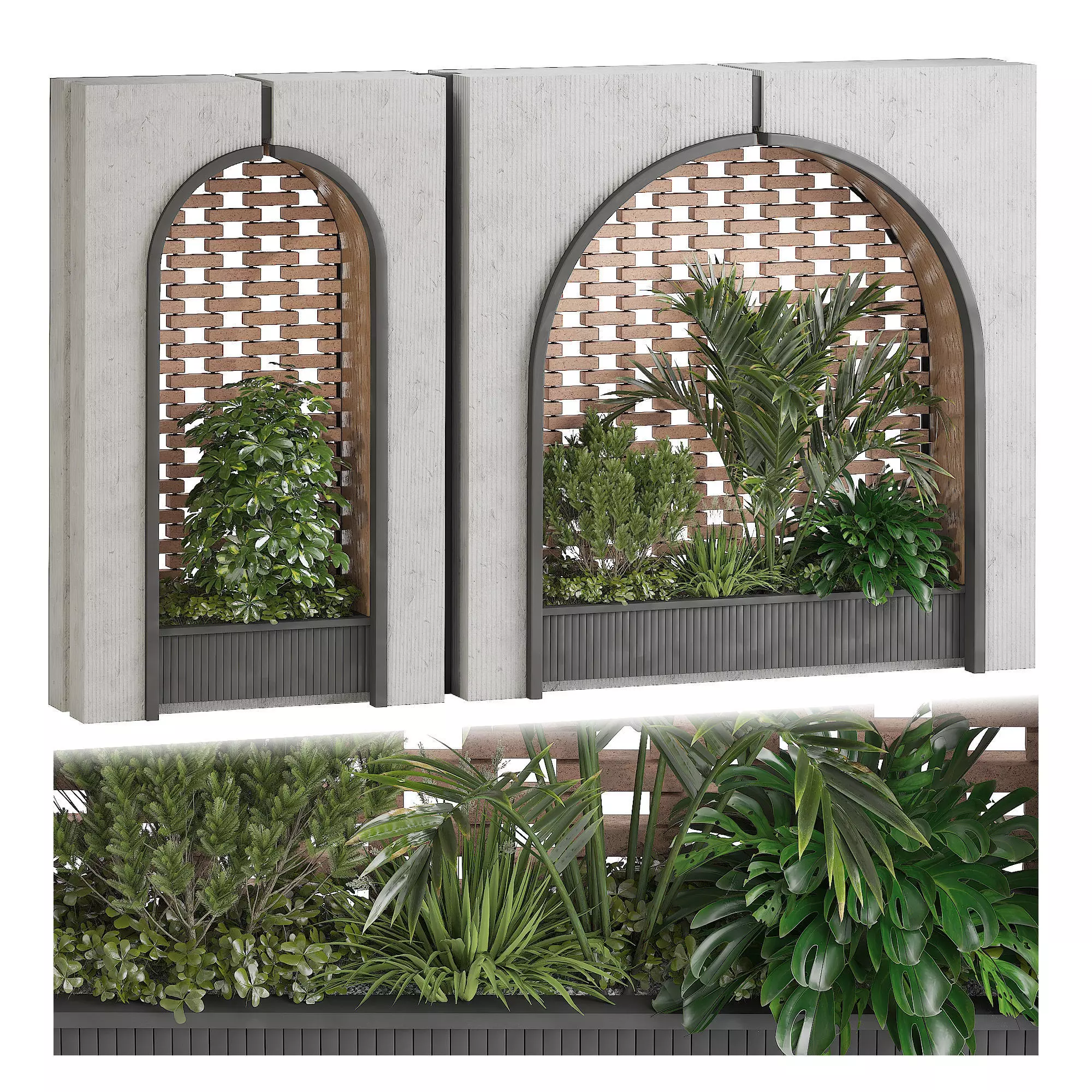 A concrete fence wall with pots that can be repeated side by side in different ways, and implemented in situ or prefabricated. This model consists of frames 250 cm long and 150 cm high, 50 cm wide, connected by metal columns. Also, in the middle of each frame, Fakhr and Madin's brick serves as a fence. The base includes a black planter box filled with lush tropical plants like Monstera and ferns, making it a perfect privacy screen or decorative element for landscape projects.