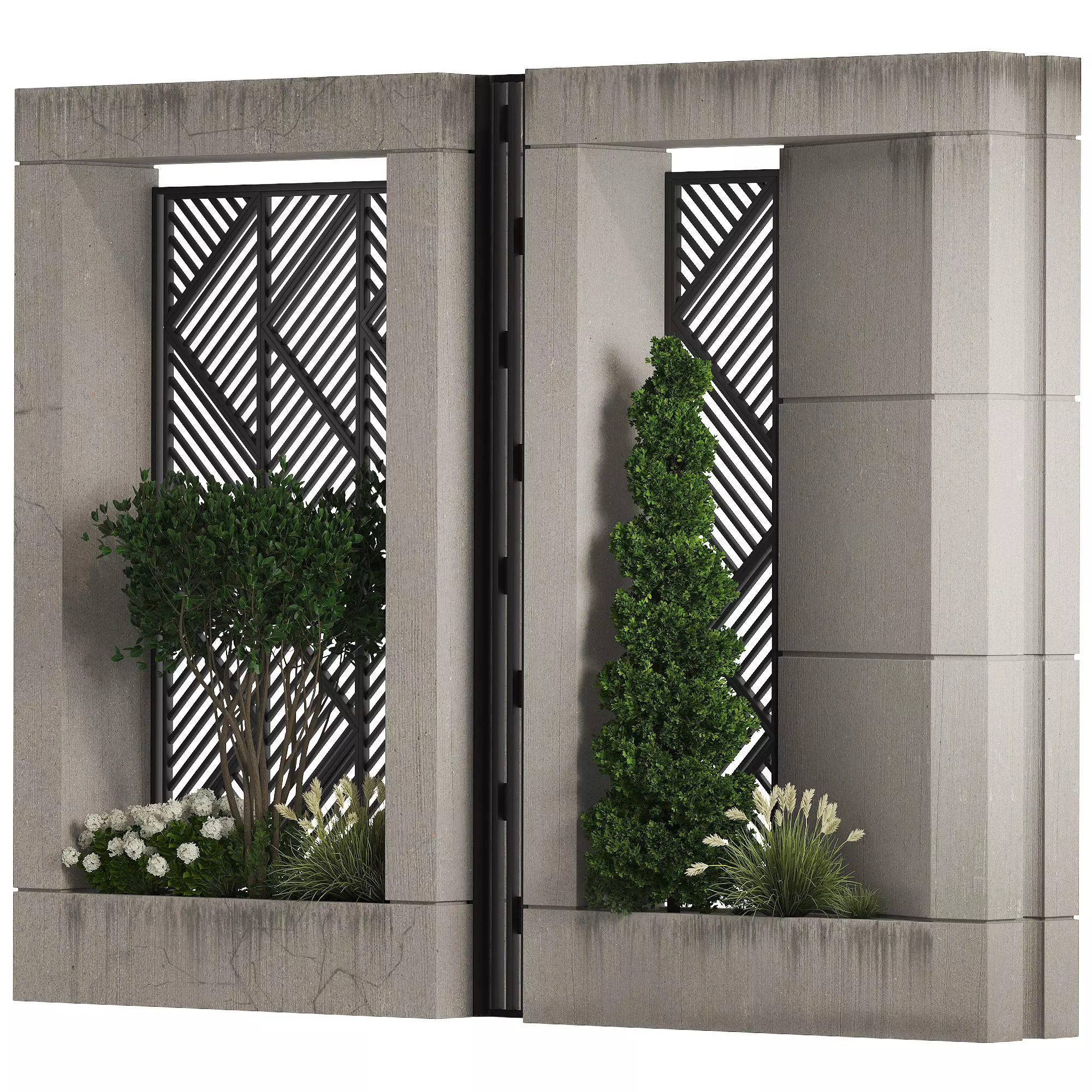 A high-quality 3D model of a modern architectural partition wall. This decorative element combines industrial raw concrete textures with elegant black metal laser-cut panels and integrated planters. It's an excellent choice for adding privacy and greenery to outdoor patios, luxury building entrances, or contemporary landscape projects.