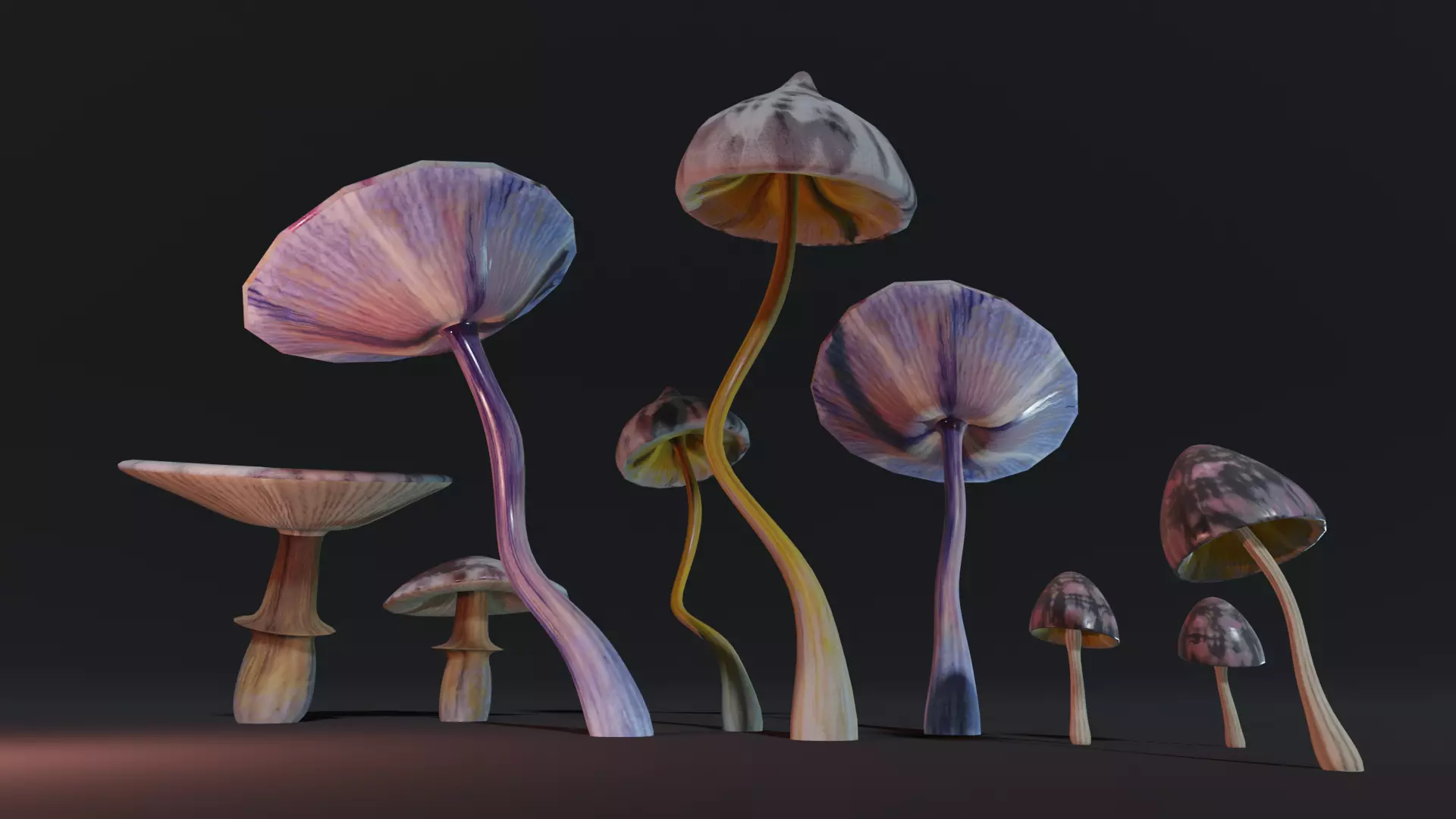 Blender file contains shape keys enabling any combination of these mushrooms to be created.