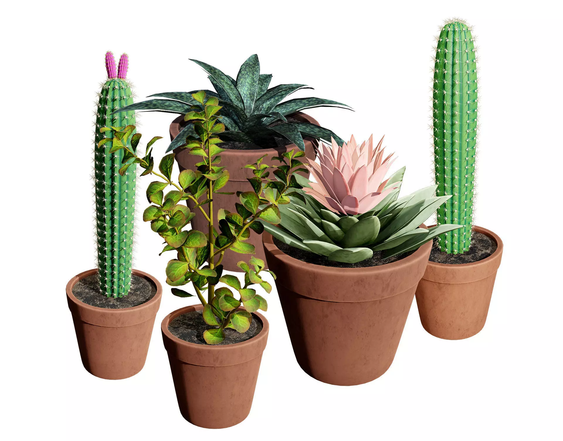 This 3D model pack features a variety of potted cacti, including cacti, succulents, and aloe vera, all on a white background. The models are highly detailed and realistic, and they are sure to add a touch of the desert to any 3D project.