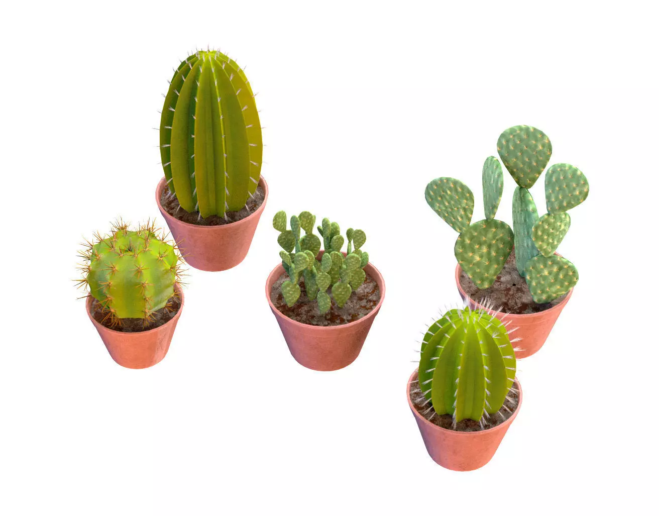 This pack includes a variety of cacti in different shapes, sizes, and textures, all meticulously modeled and textured to bring a touch of the desert to your projects. Each cactus is placed in a unique pot, adding a pop of color and variety to your scene.
