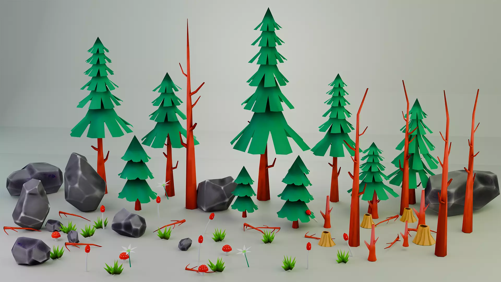 What’s Included• Multiple stylized pine tree variations in different heights• Dead trees and dry trunks• Large and small rocks• Tree stumps• Fallen branches• Grass clusters• Stylized mushrooms• Decorative flowers• Small ground props