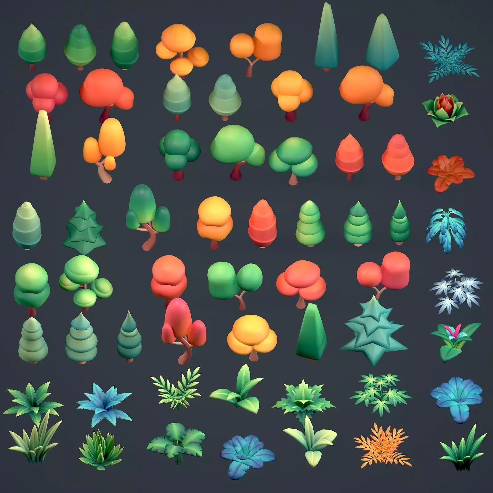 Stylized lowpoly plants and trees set. This set of stylized low poly plants and trees includes 16 types of low poly plants and 41 types of low poly trees. Perfect for both mobile games and full-fledged serious projects. High-quality topology, correct Unwrapped UVs and low weight of the model - all for your convenience. The whole set consists of 74,362 polygons and 73,662 vertices.