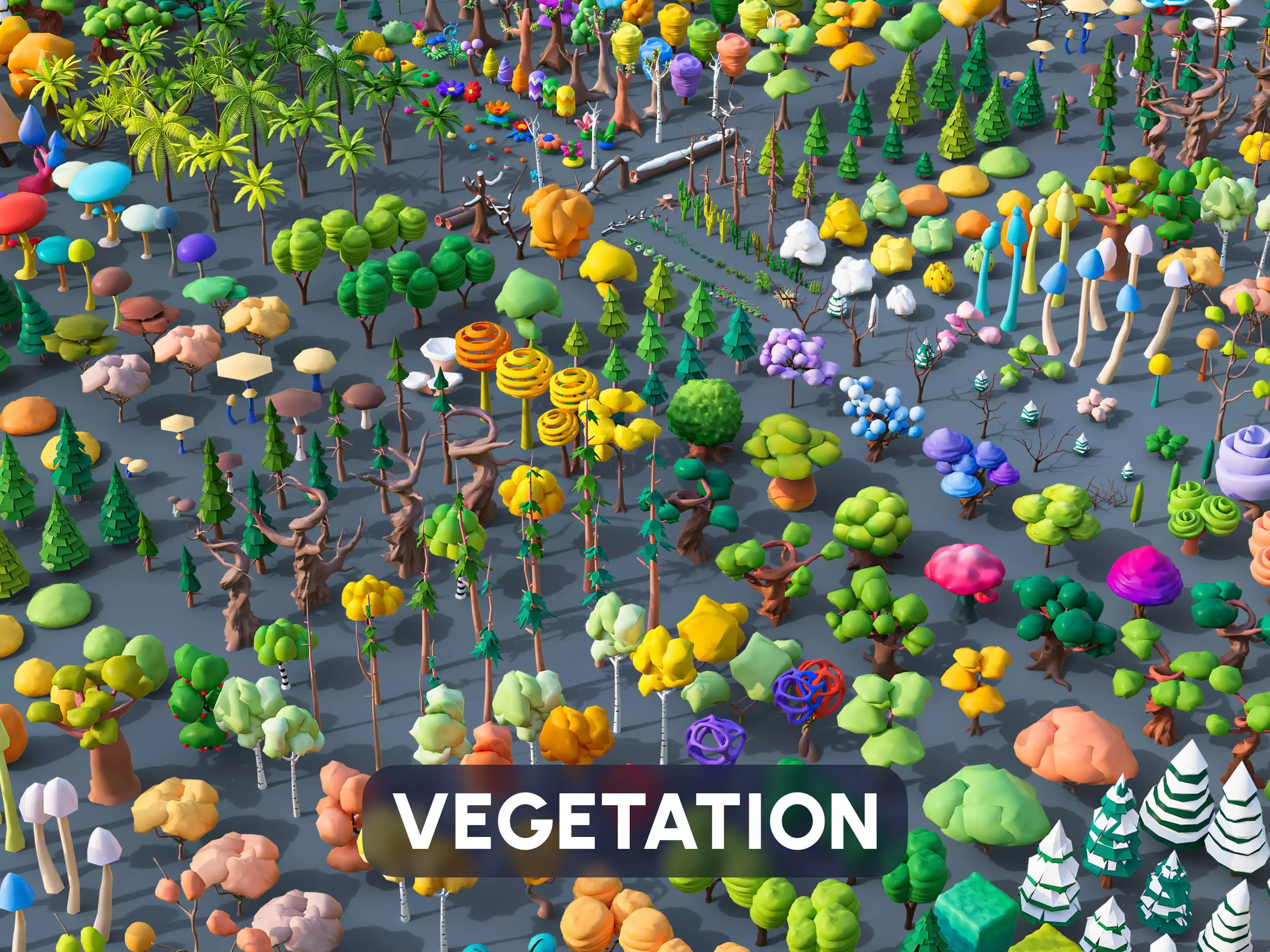 Vegetation is a package of low-polygon 3D models optimized for game engines, consisting of 504 assets such as deciduous, coniferous trees, palms, Savannah trees, bushes, fantastic plants and much more!