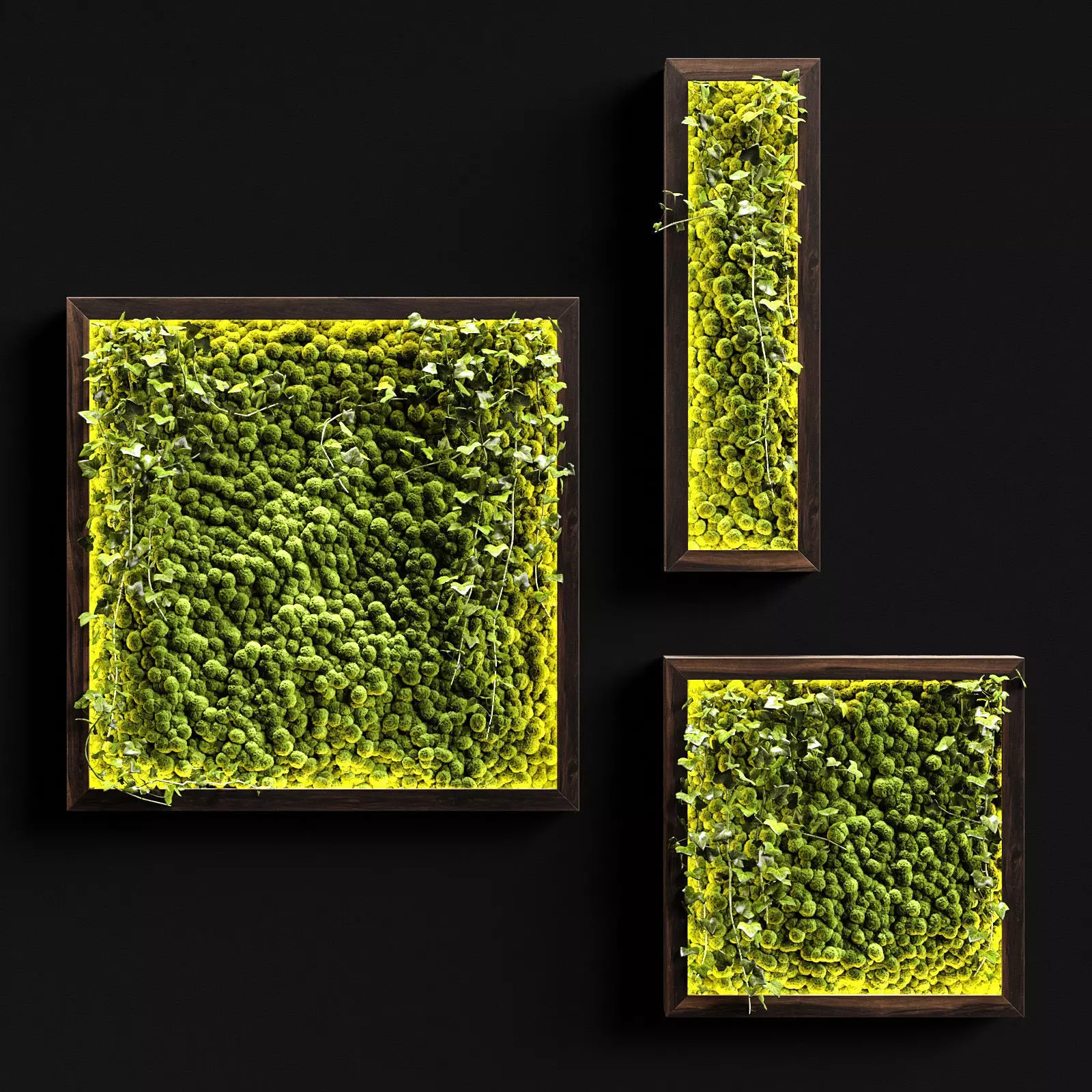 Vertical landscaping in the form of three phytowalls in a wooden frame with LED lighting. Suitable for both loft and modern interiors. It can be used as a decor over the head of the bed or desktop in the nursery. It can also be used as an accent in the living room or kitchen. It can also be used in various public areas, such as a restaurant, bar, cafe or club.