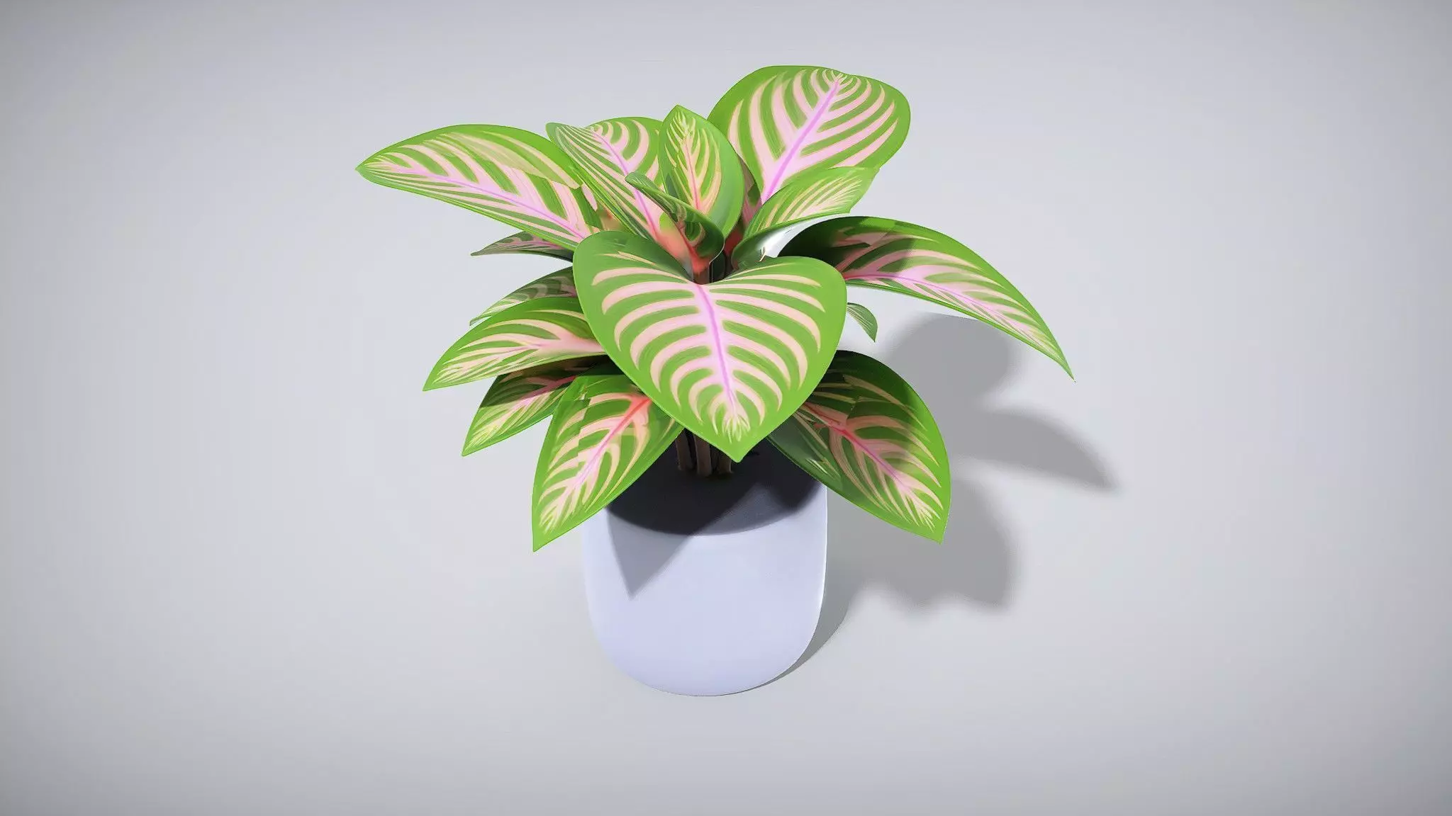 This model features a vibrant Calathea ornata plant with large, oval leaves adorned with striking pink stripes and a velvety texture. Each leaf is meticulously detailed, showcasing a rich green color that contrasts beautifully with the delicate pink patterns. The model is suitable for various applications, including interior design visualizations, botanical illustrations, and educational materials.