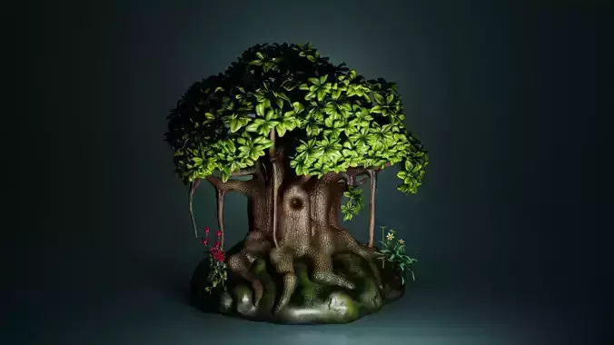 The dense foliage canopy represents nourishment and protection, while smaller plants at the base highlight biodiversity and interconnected life systems. Though rendered in a fairy-tale aesthetic, the work remains grounded in botanical structure and natural growth logic.