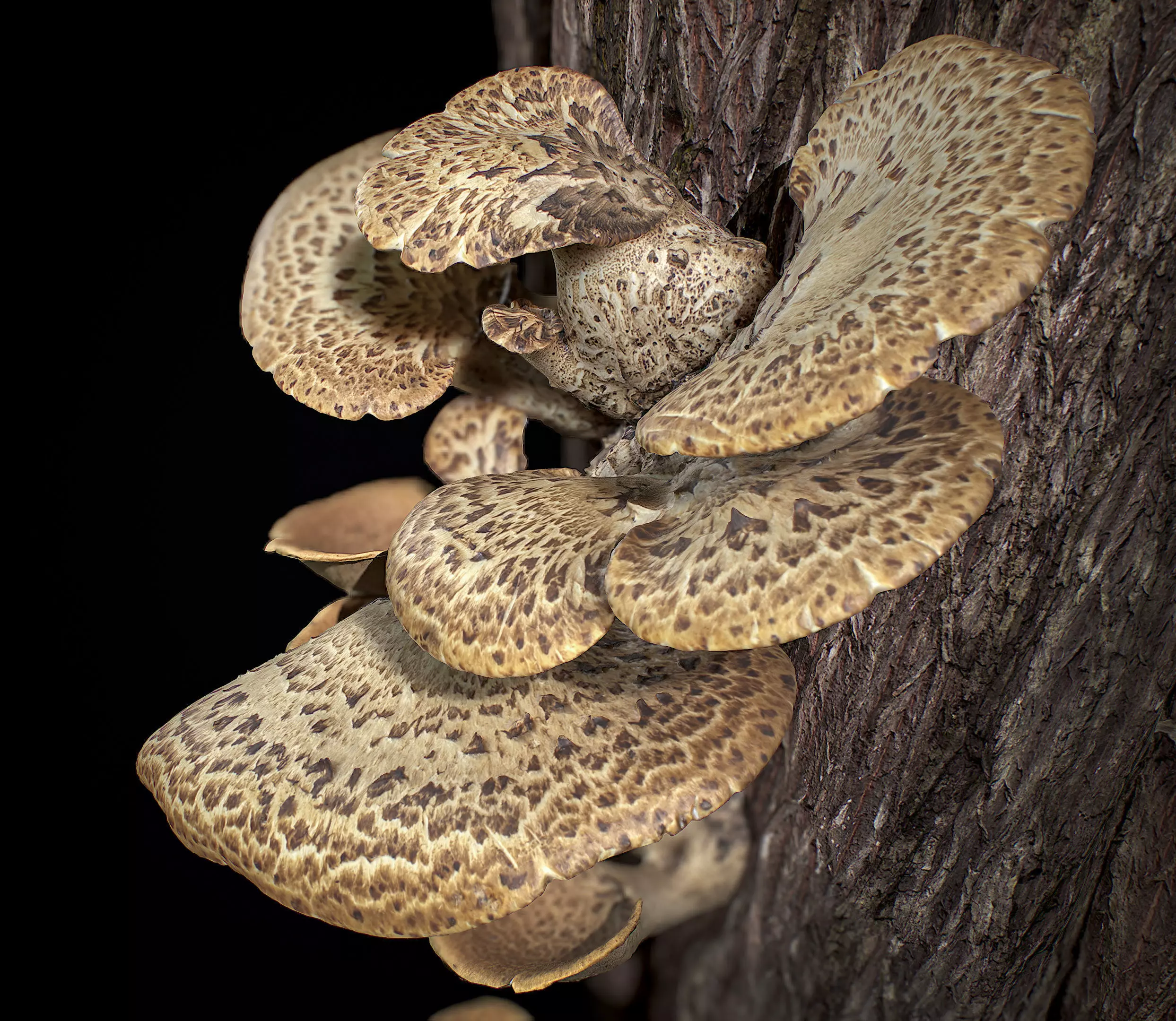 Bracket fungus, with common names including dryad's saddle and pheasant's back mushroom.The fungus grows on living and dead deciduous trees, mostly on maples. Edible at a young age.