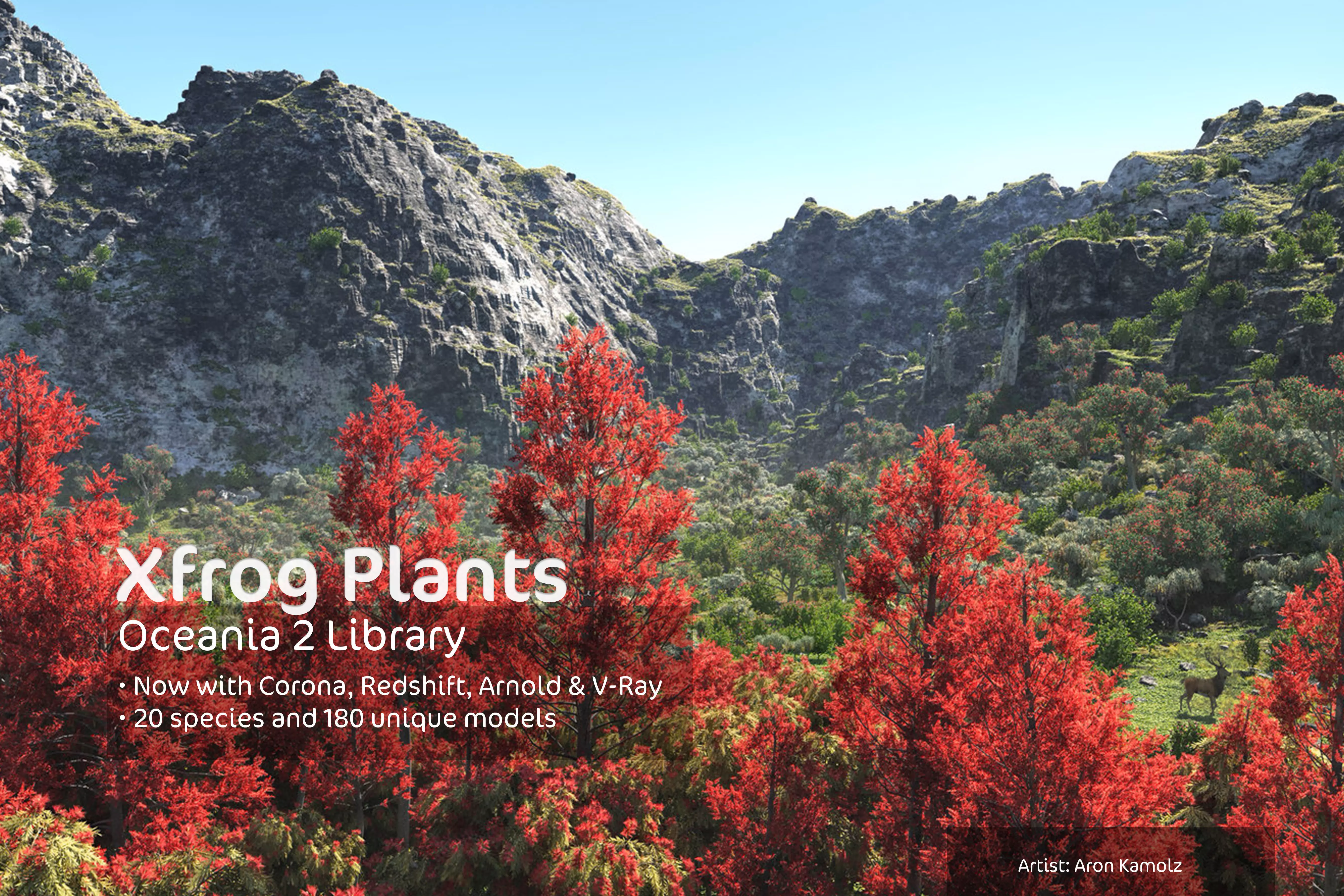 XfrogPlants OCEANIA 2 is a set of models which includes 180 trees and plants of the Oceanic region including the True Mulga, Brigalow, Roughbarked Apple, Alexandra Palm, Bangalow Palm, Saw Banksia, Illawarra Flame Tree, Willow Bottlebrush, Common Net Bush, Carpentaria Palm, Ghost Gum, Southern Mahogany, River Redgum, Karri, Rusty Fig, Silky Oak, Australian Cabbage Palm, Carnarvon Gorge Macrozamia, Orange Jasmine and Australian Grass Tree. PDFs in 7 languages, with the origin story and renders of each plants are on this page in the Additional files area, and linked to inside the zip.