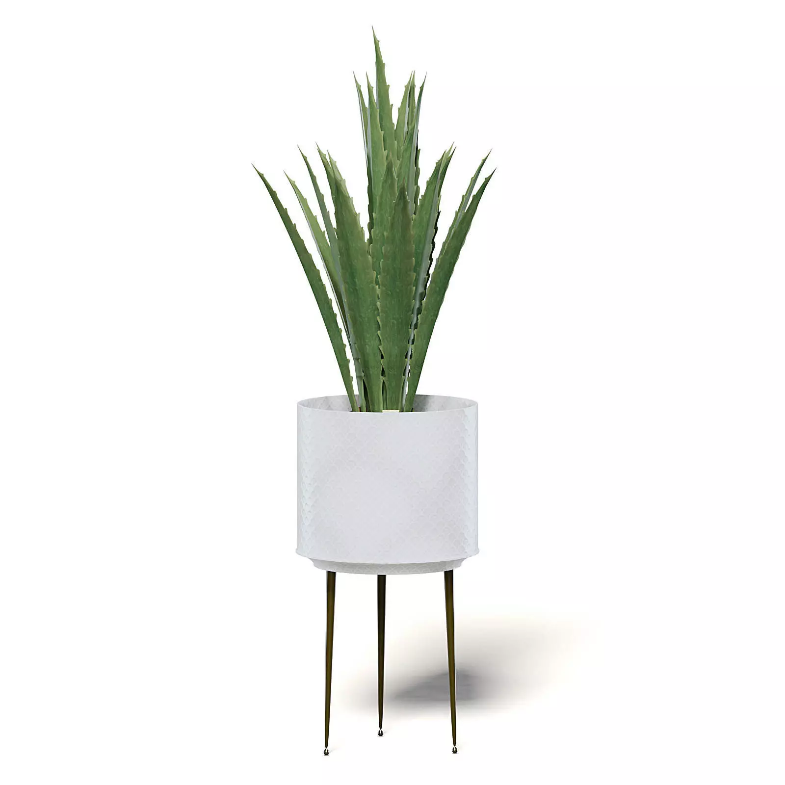 Aloe in white pot 3d model on three dark legs. Compatible with 3ds max 2010 (V-Ray, Mental Ray, Corona) or higher, Cinema 4D R15 (V-Ray, Advanced Renderer), Unreal Engine, FBX and OBJ.