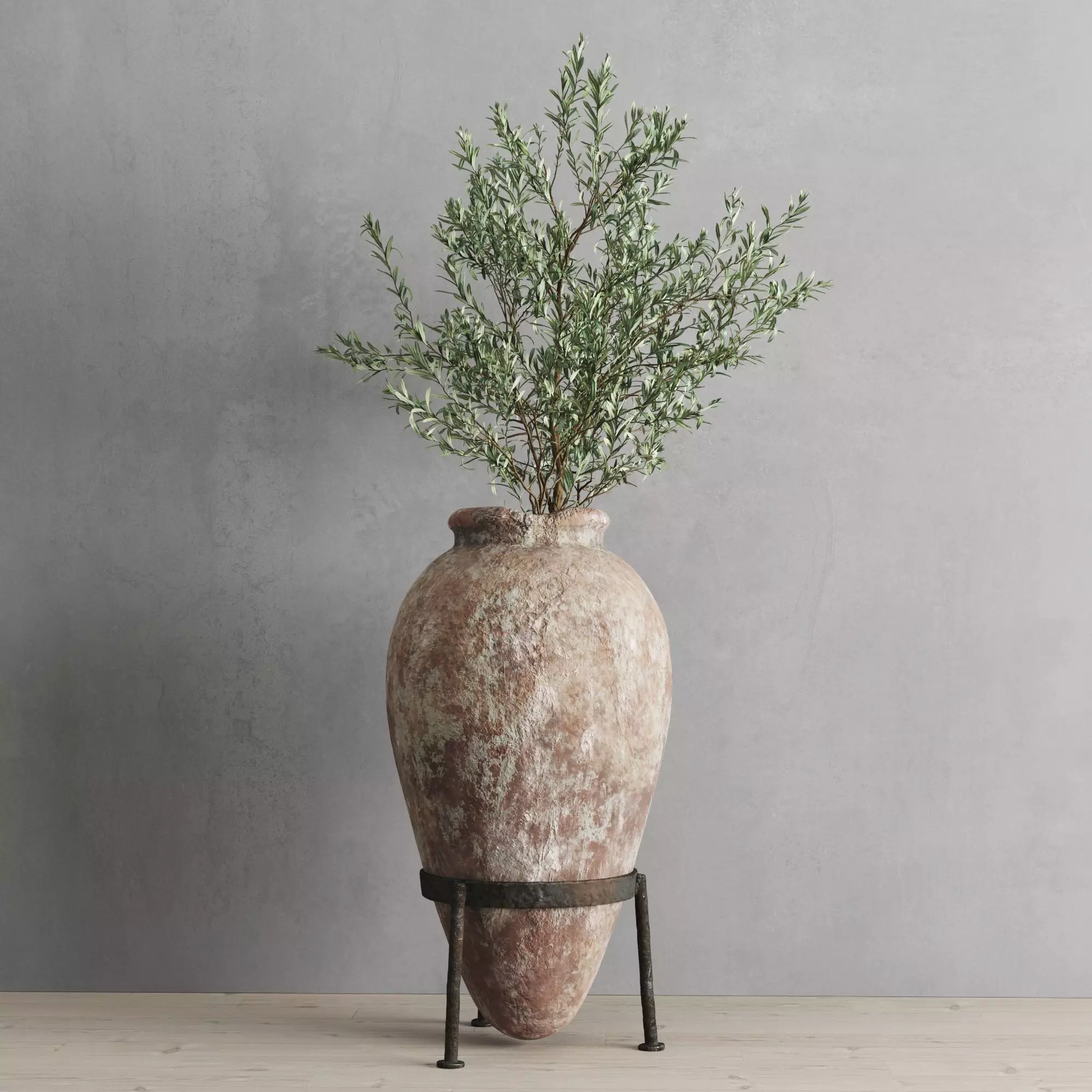 Antique clay vessel on a metal stand and a branch of European Oliva.In the archive:-3Ds Max 2015 + Corona render-FBX-Textures