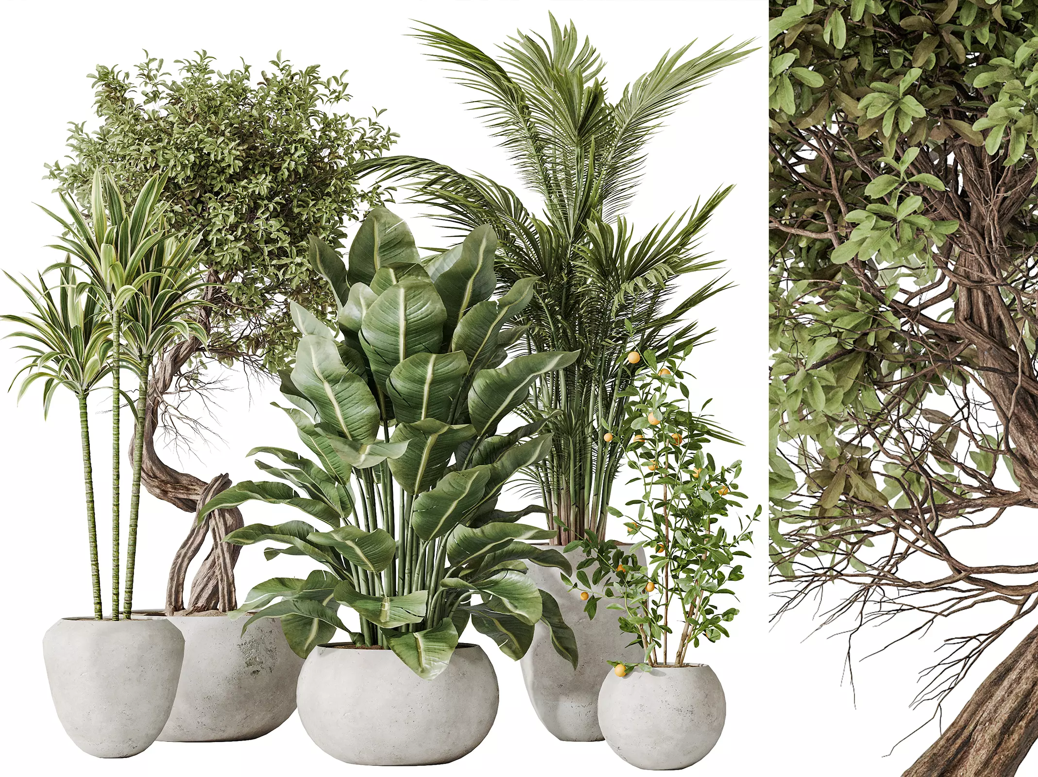 AV Indoor plants set 197 Ficus Bonsai Ginseng and Lemon Lime Cane Dragon and ParadiseBird and Areca Palm