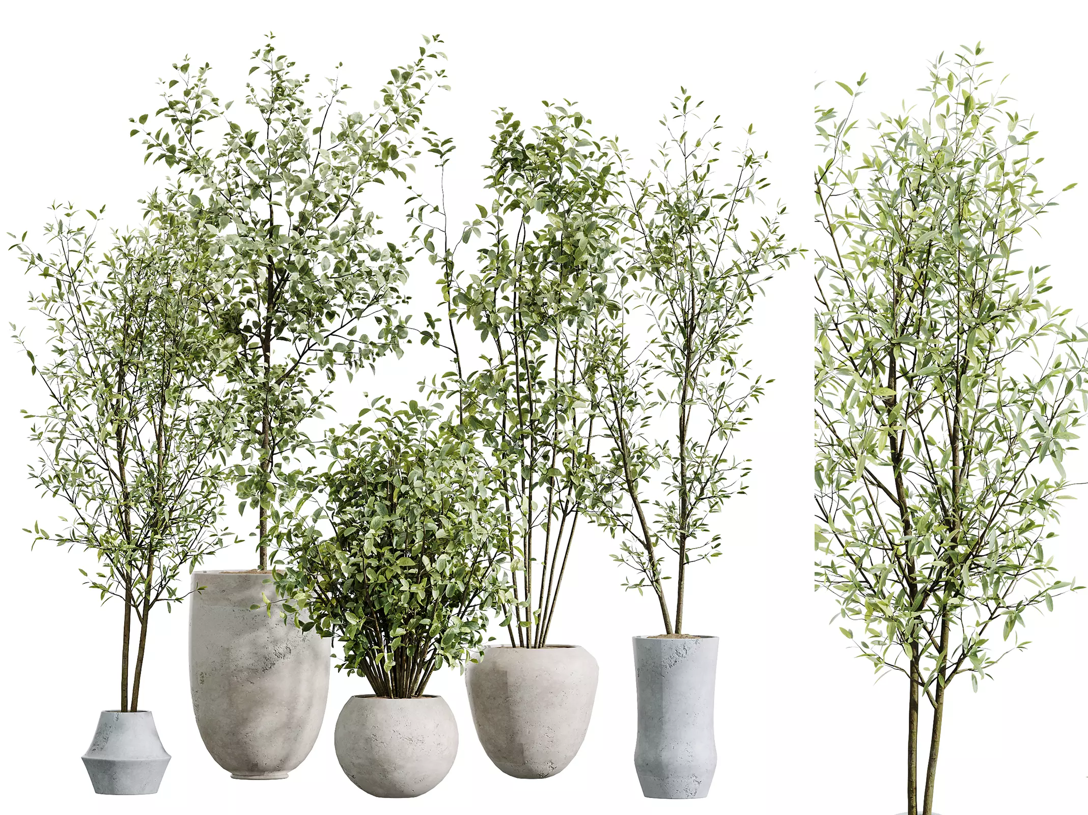 The AV Indoor Plants Set 213 3D Model features a beautifully curated collection of decorative indoor plants, all from the same leafy green family—Beech, Olive (Olea Europaea), Mini Fig, and Eucalyptus types. Despite subtle variation in foliage density and height, the set maintains botanical harmony, making it perfect for cohesive, naturalistic interior styling.