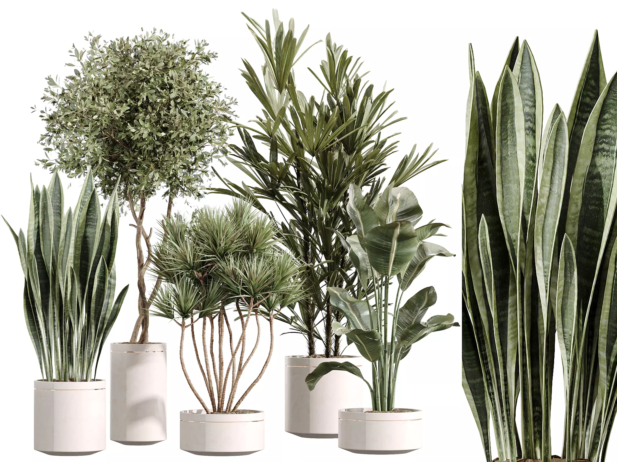 AV Indoor Plants Set 254 is a curated selection of bold sculptural houseplants, designed to bring expressive greenery and architectural presence to refined interiors. Each species in this set complements the others through contrast in leaf texture, verticality, and volume, while all are elegantly presented in uniform ceramic cylinders with a polished ivory finish and soft golden trim.