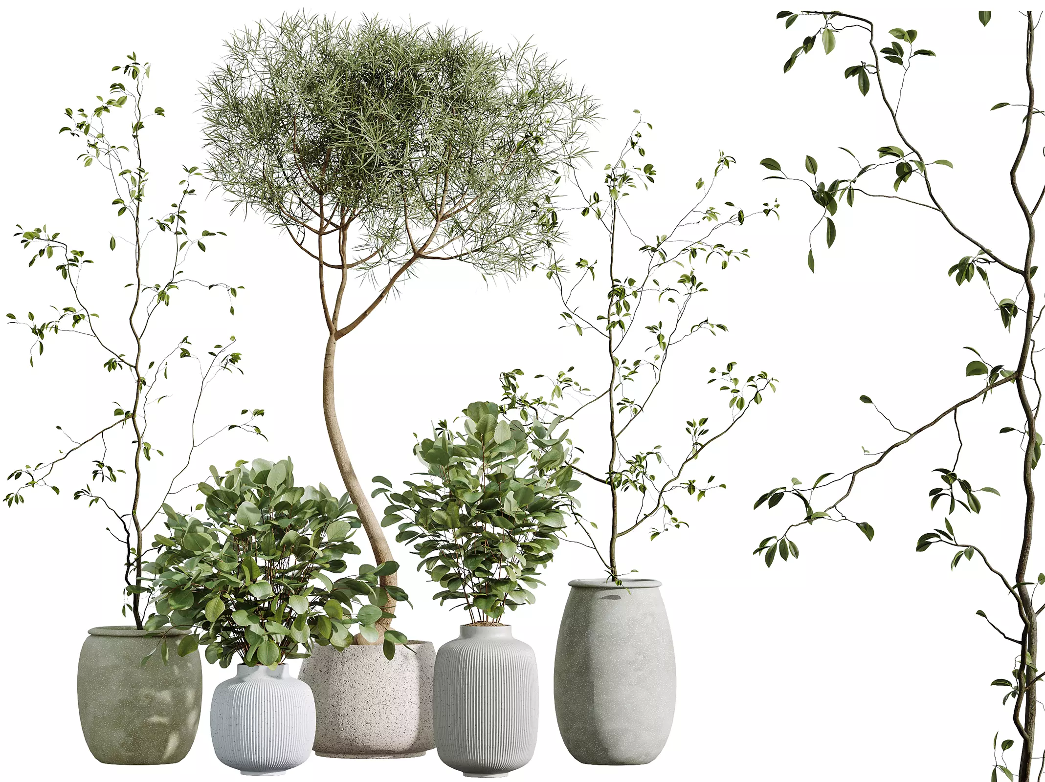 This refined indoor plant collection celebrates minimalist aesthetics and botanical authenticity. Featuring the slender, expressive silhouette of the Japandi-style Ficus Dracaena Marginata and the soft, rounded foliage of the Dollar Eucalyptus bouquet, this arrangement radiates balance and visual freshness. The Eucalyptus, known for its calming fragrance and silvery-green tone, evokes the serene landscapes of Australia. Paired with the bold lines of Ficus, it offers a unique contrast ideal for modern interiors. Each plant is elegantly placed in hand-crafted ceramic or concrete-inspired pots with earthy textures, designed to enhance architectural renders with a touch of poetic realism.
